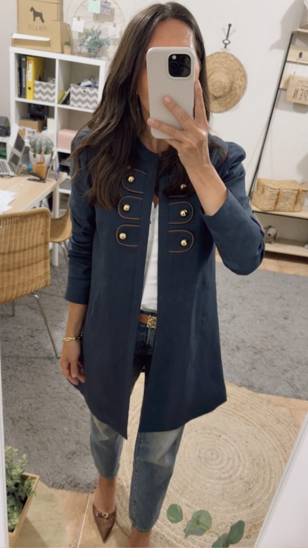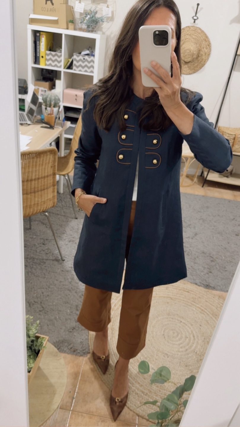 Abrigo corto confeccionado en lino marino .Corte ligeramente trapecio, escote redondo, detalle en delantero de piezas ribeteadas en cordón avellana y botón dorado decorativo ( abrocha con corchetes invisibles). Hombrera fina.Pliegue profundo en espada con trabilla y botones dorados. Bolsillos en costura lateral.Forro interior rayas azul.