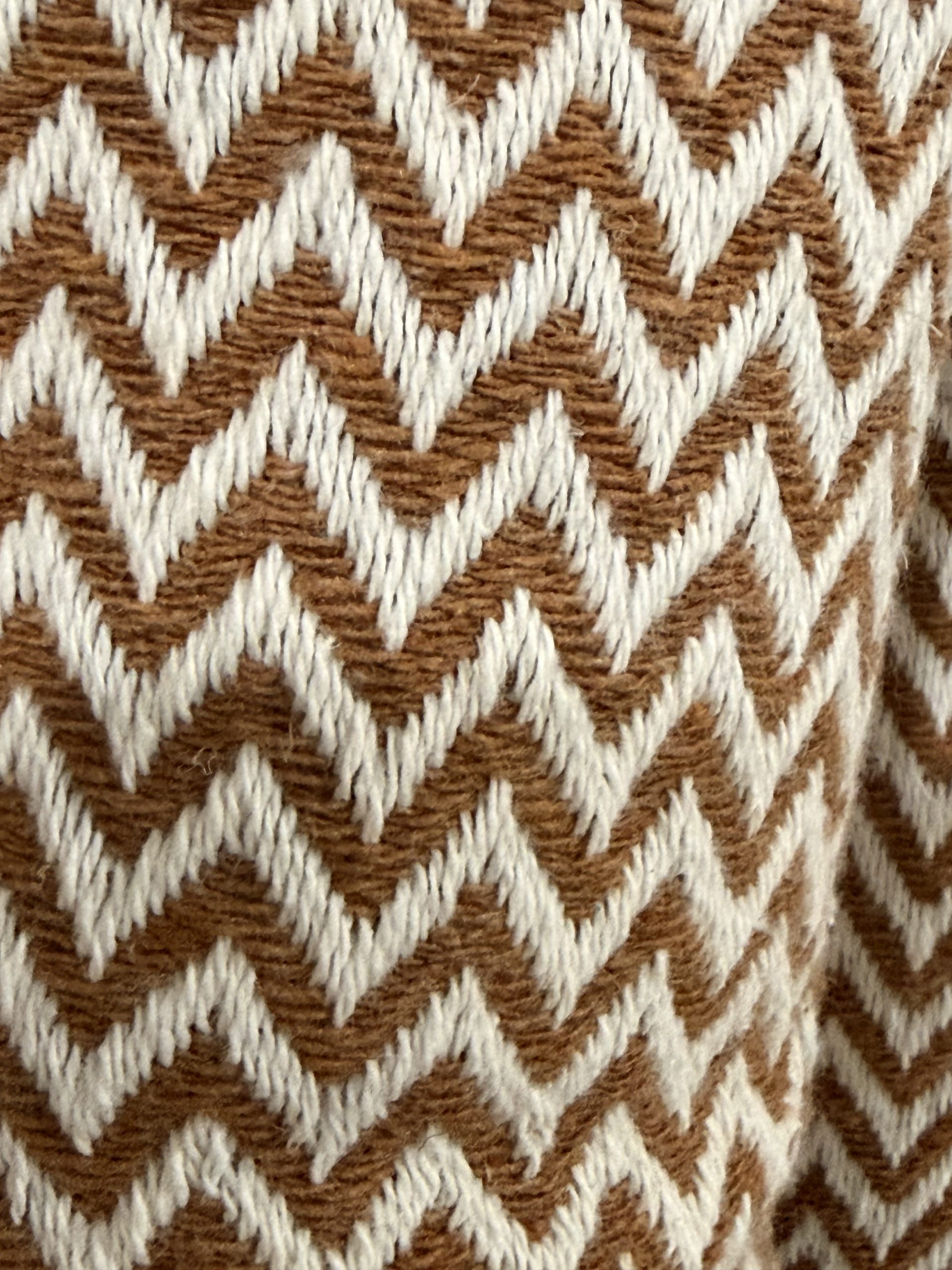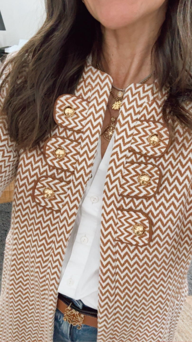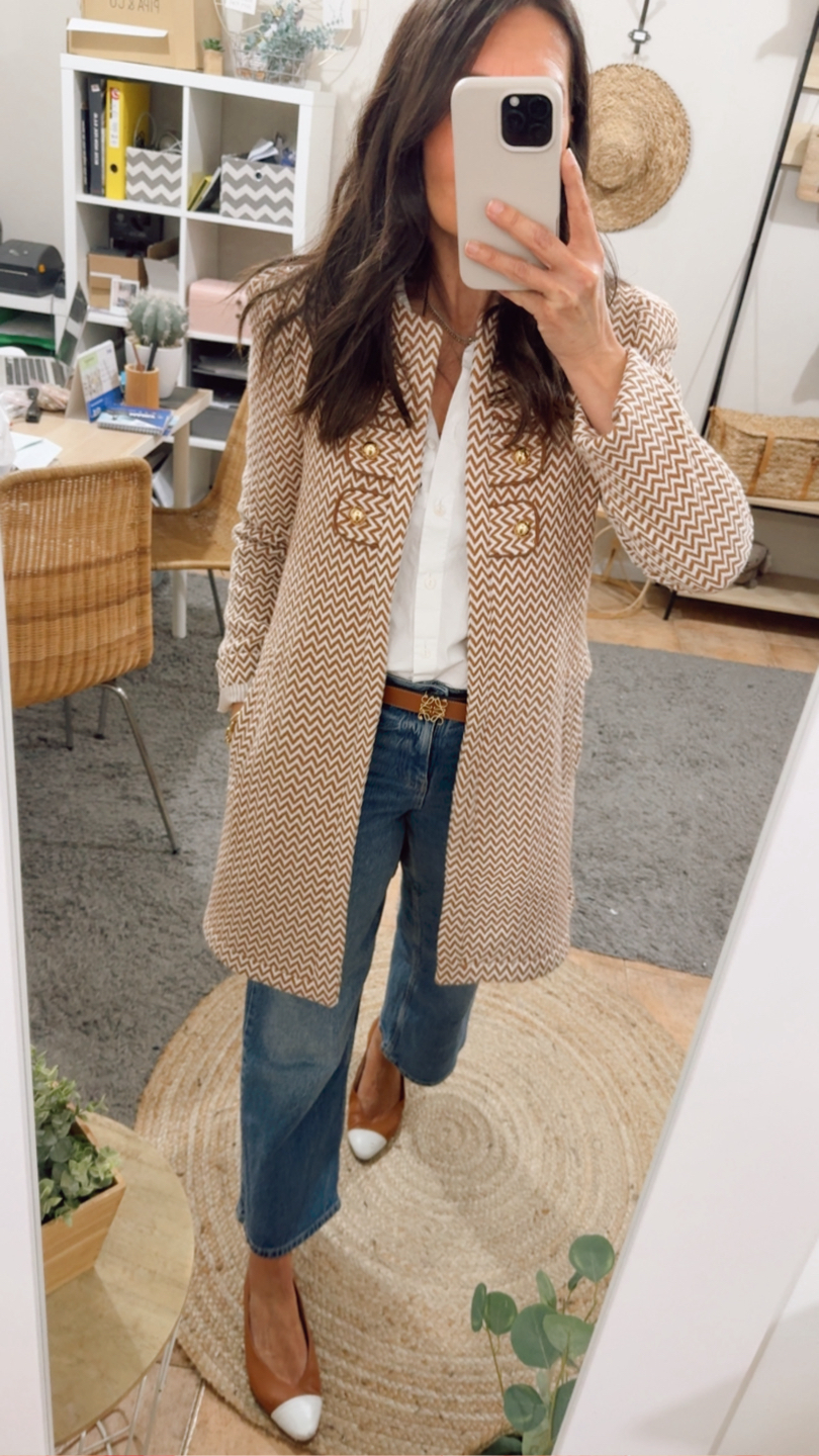 Abrigo corto tejido punto tipo tricot 100% algodón.Corte ligeramente trapecio, escote redondo, detalle en delantero de piezas ribeteadas en cordón a tono y botón dorado decorativo ( abrocha con corchetes invisibles).Pliegue profundo en espada con trabilla y botones dorados. Bolsillos en costura lateral .Forro interior rayas cámel.