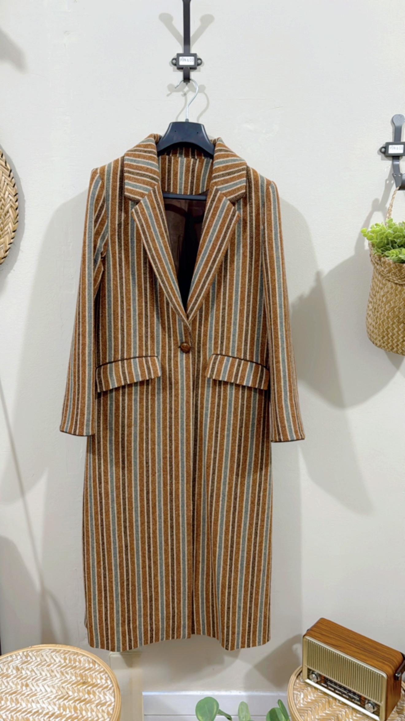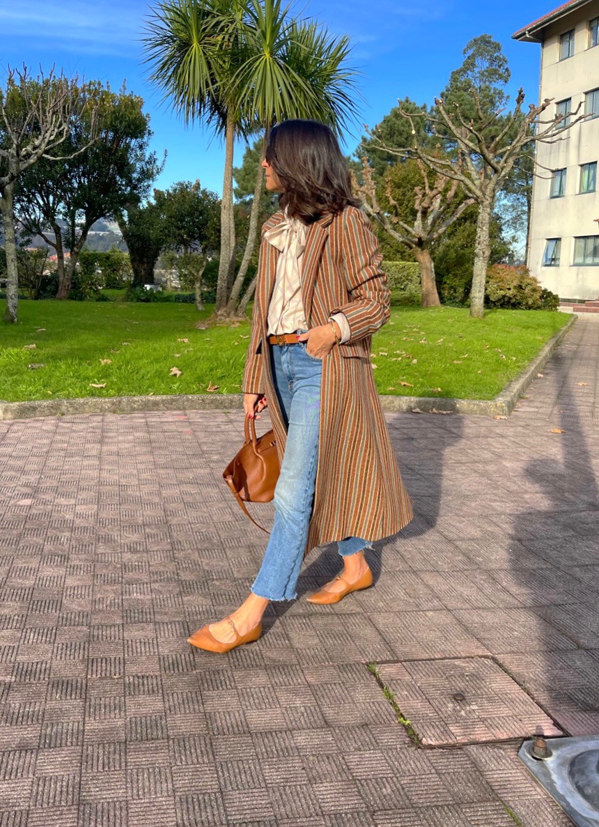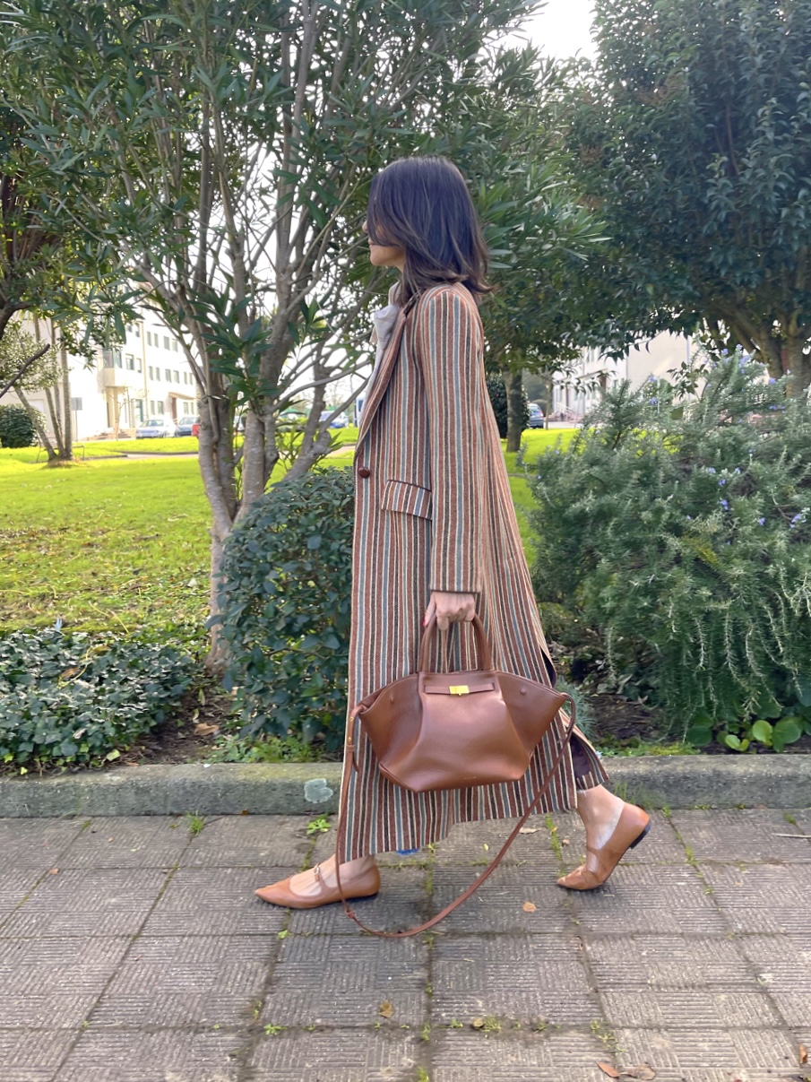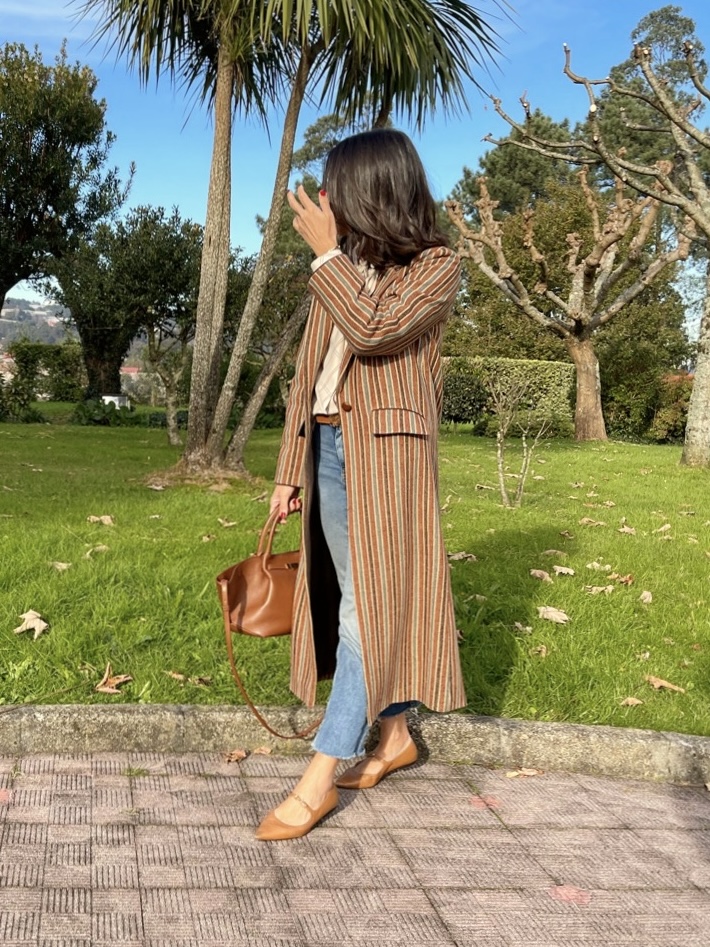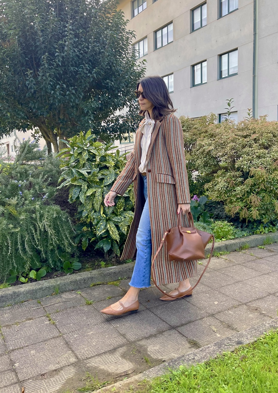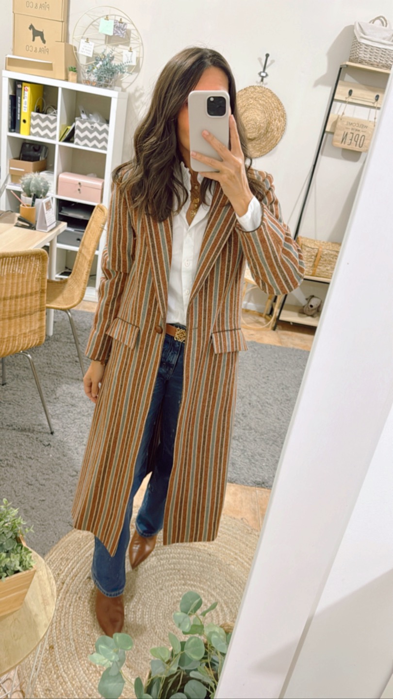 Abrigo clásico paño 100% Lana Shetland rayas. Corte recto, bolsillos con tapeta, amplia abertura en espalda. Detalles de cordón marrón en puño y parte superior tapeta. Abrocha con botón piel avellana.