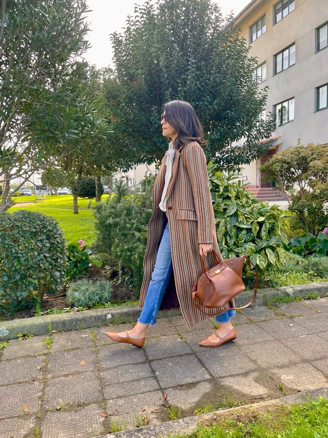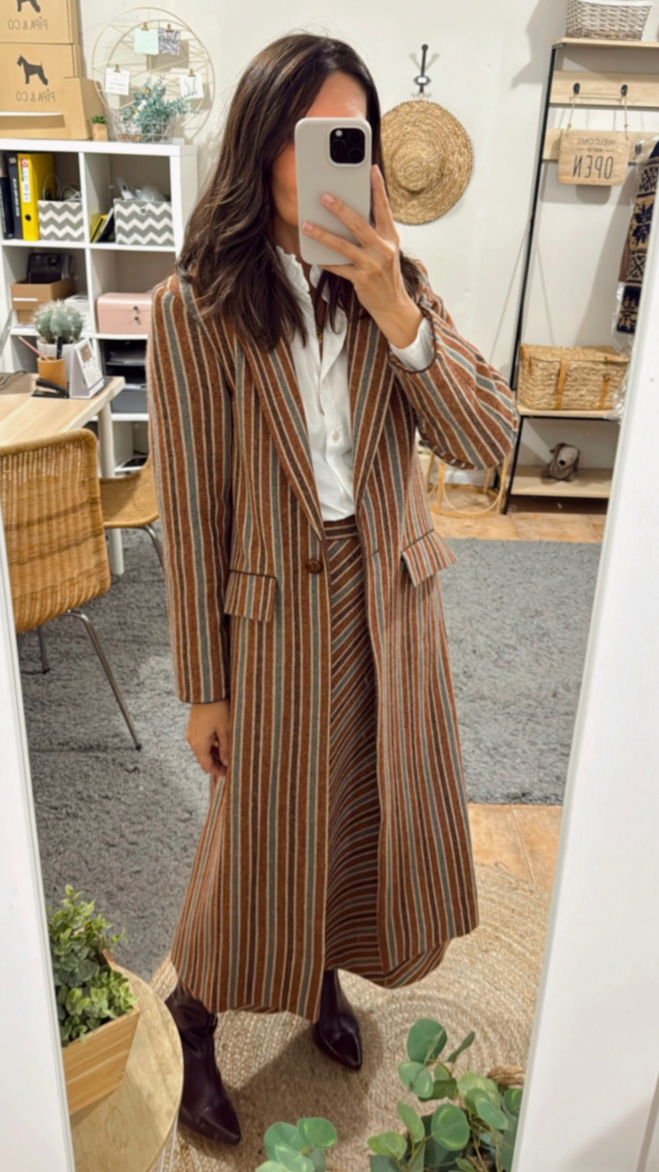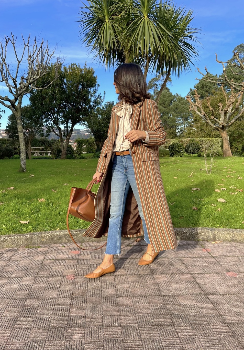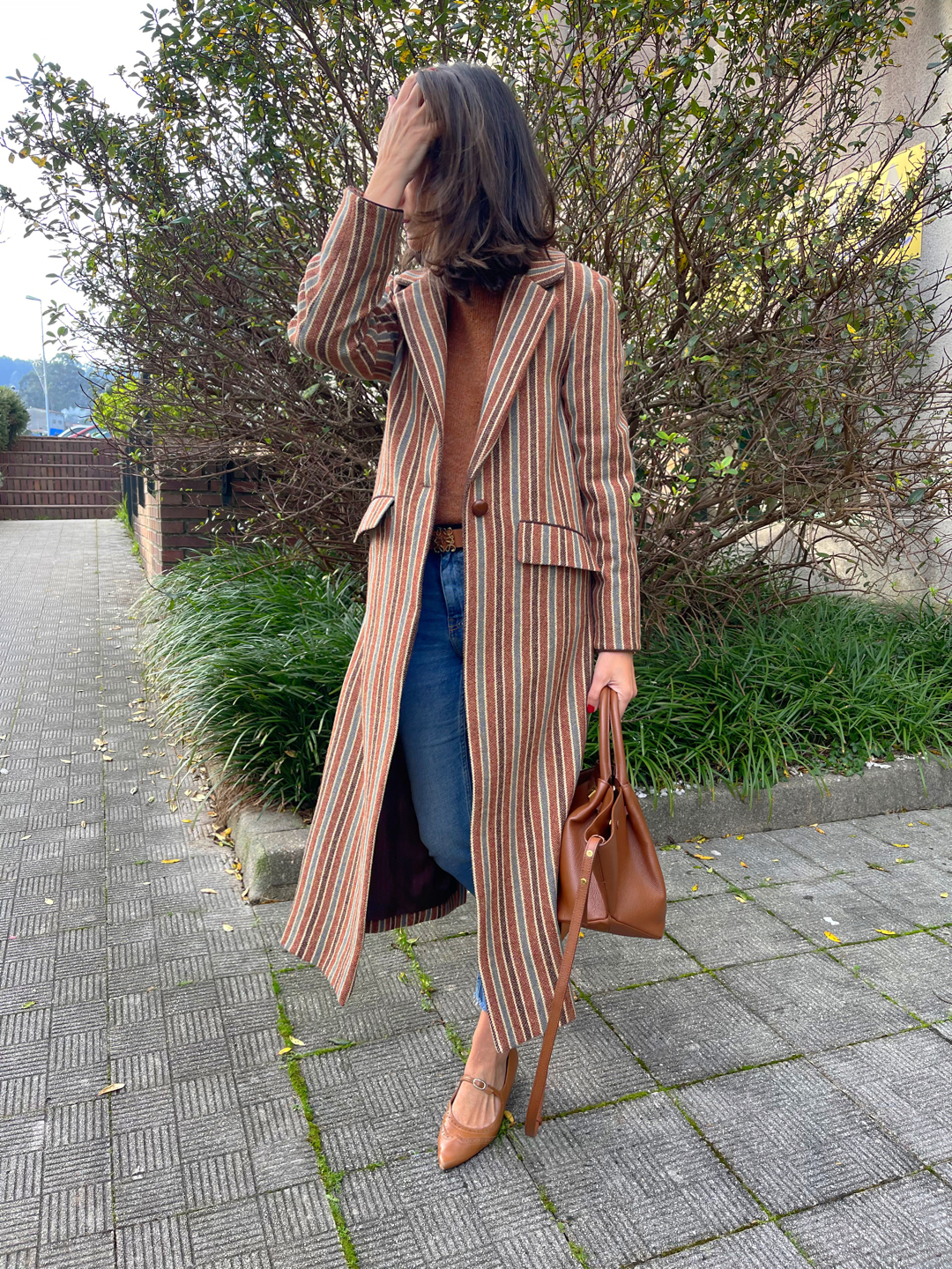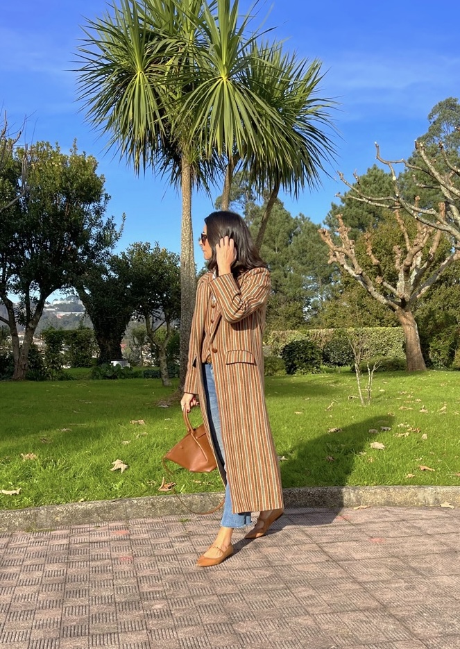 Abrigo clásico paño 100% Lana Shetland rayas. Corte recto, bolsillos con tapeta, amplia abertura en espalda. Detalles de cordón marrón en puño y parte superior tapeta. Abrocha con botón piel avellana.