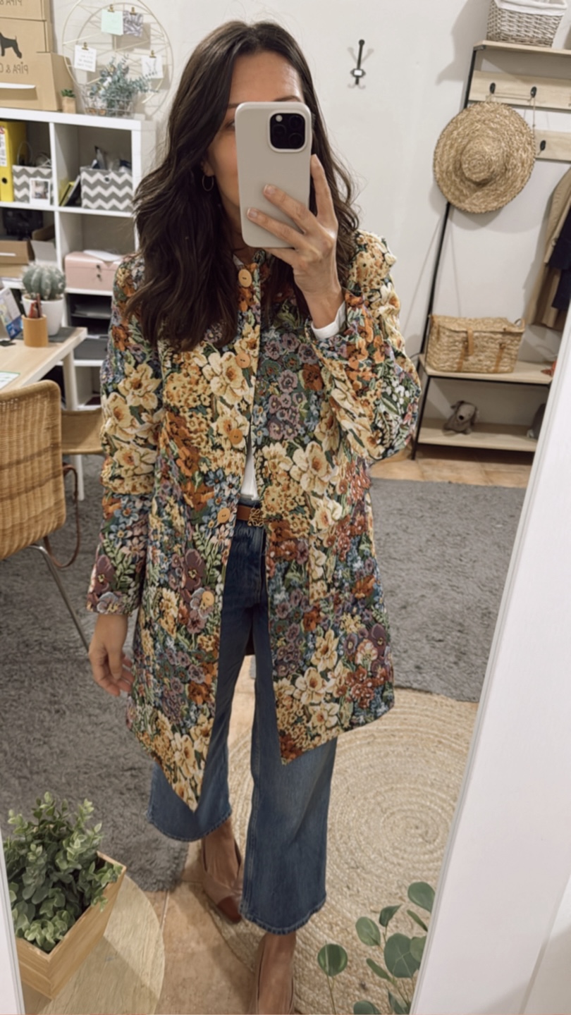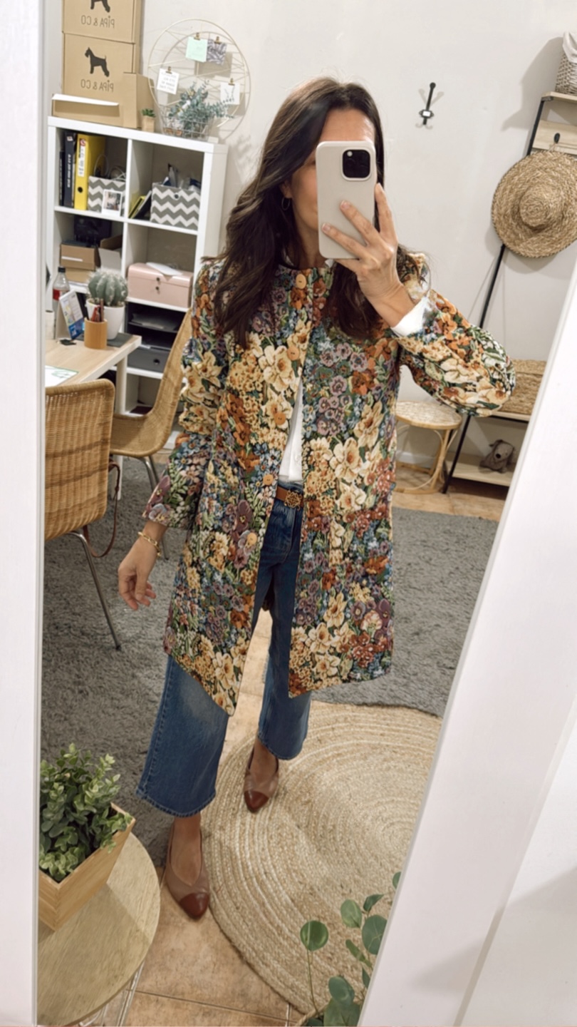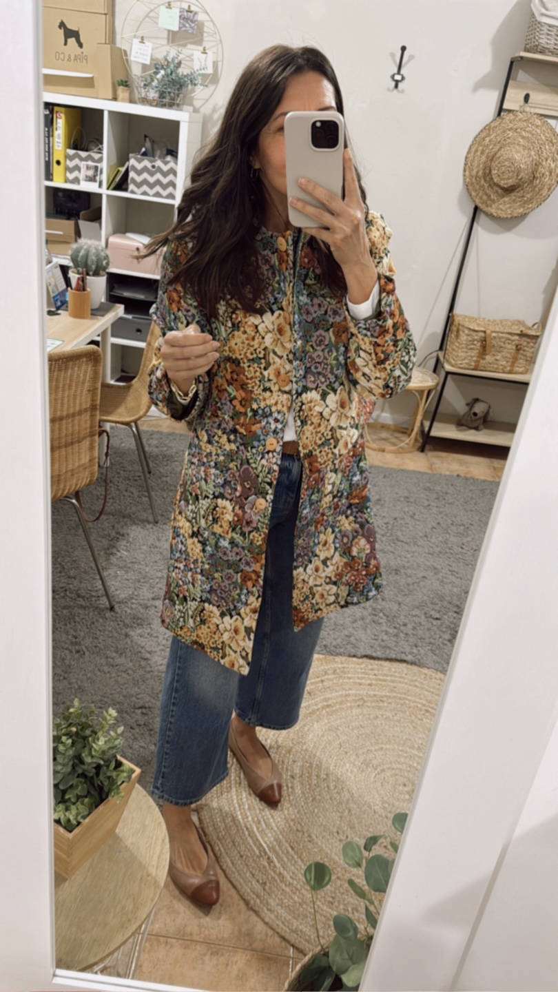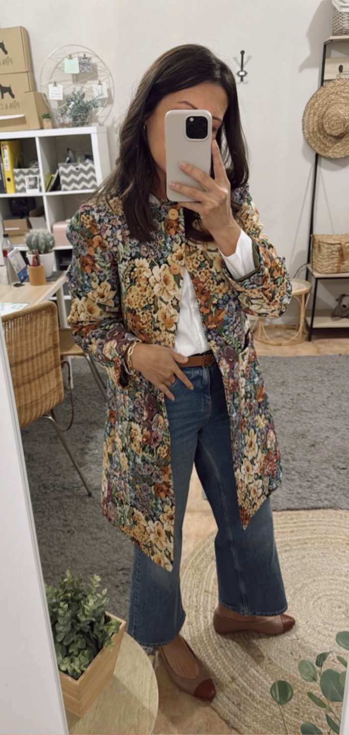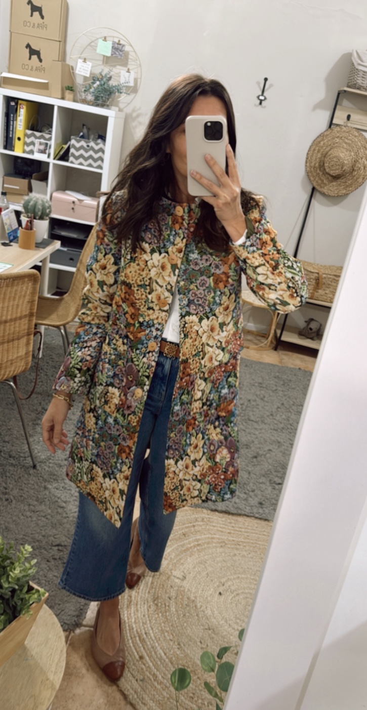 Abrigo corto tejido jacquard motivos florales (tela tipo tápiz ).Corte ligeramente trapecio, escote redondo, botonadura simple , bolsillos delanteros de plastrón, pliegue profundo en espada con trabilla y botones. Botones de madera .Forro interior.