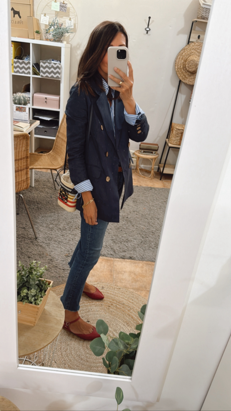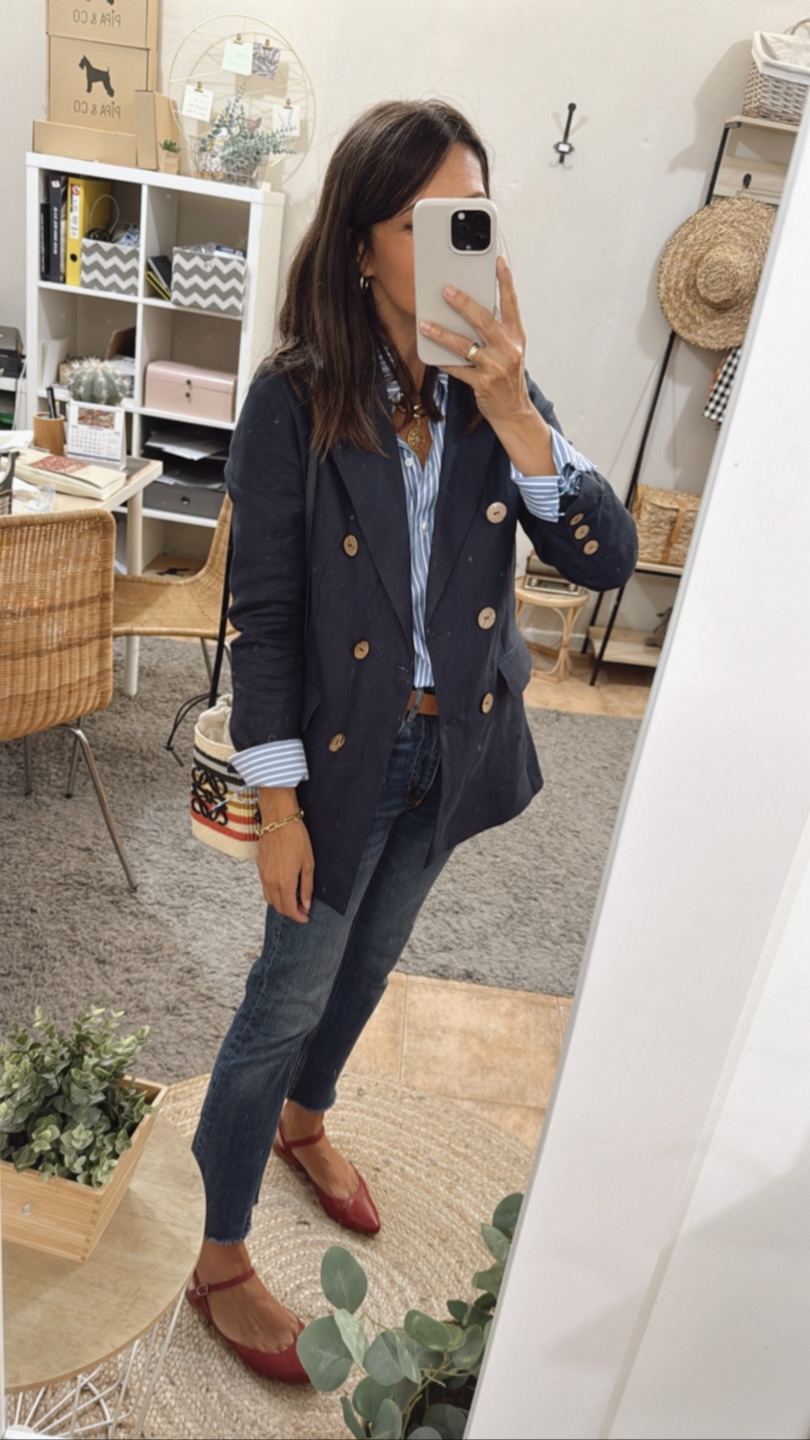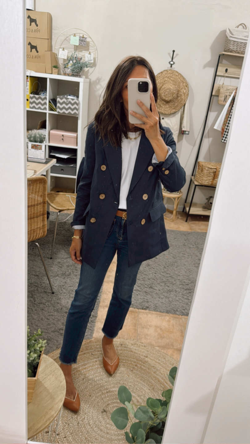 Americana lino azul. Corte entallado, hombro encajado, escote pico con solapa, delantero con traspaso y doble botonadura de coco. Bolsillos con tapeta. Forro interior rayas.