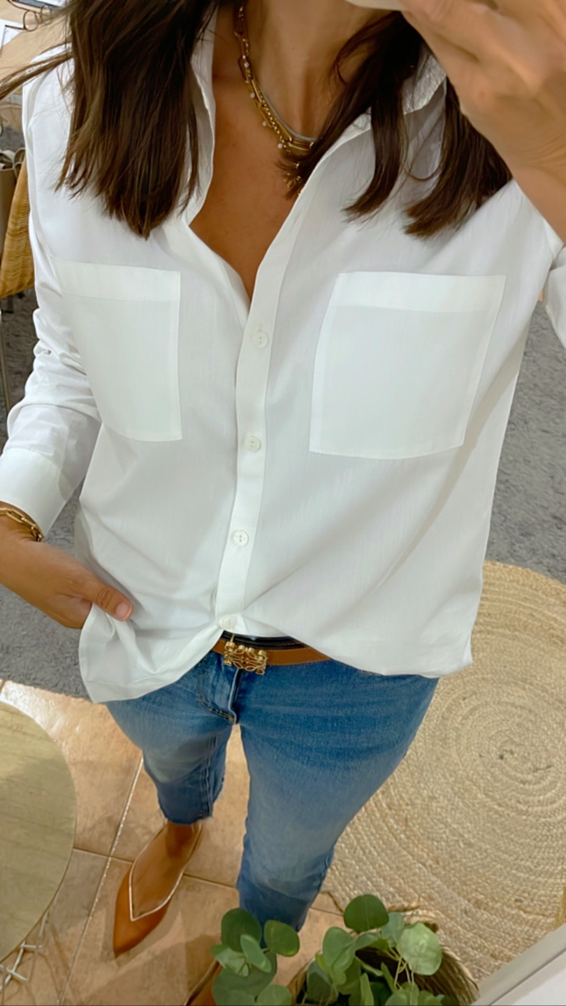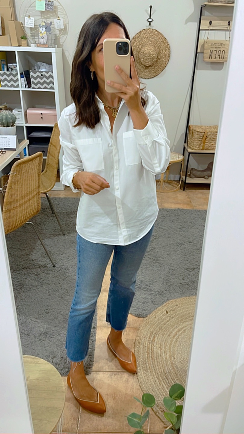 Camisa popelin blanco . Cuello camisero, corte oversize.