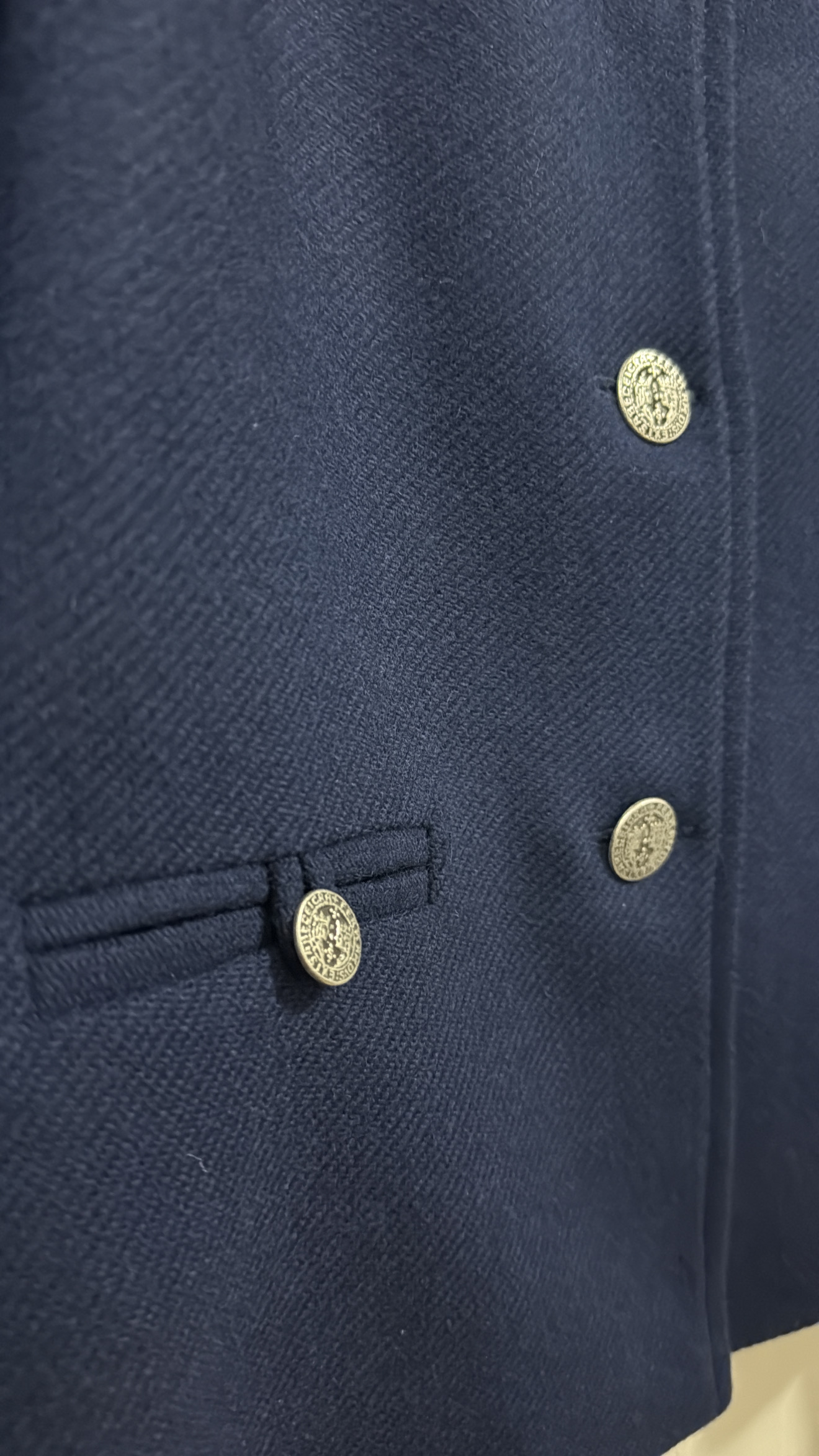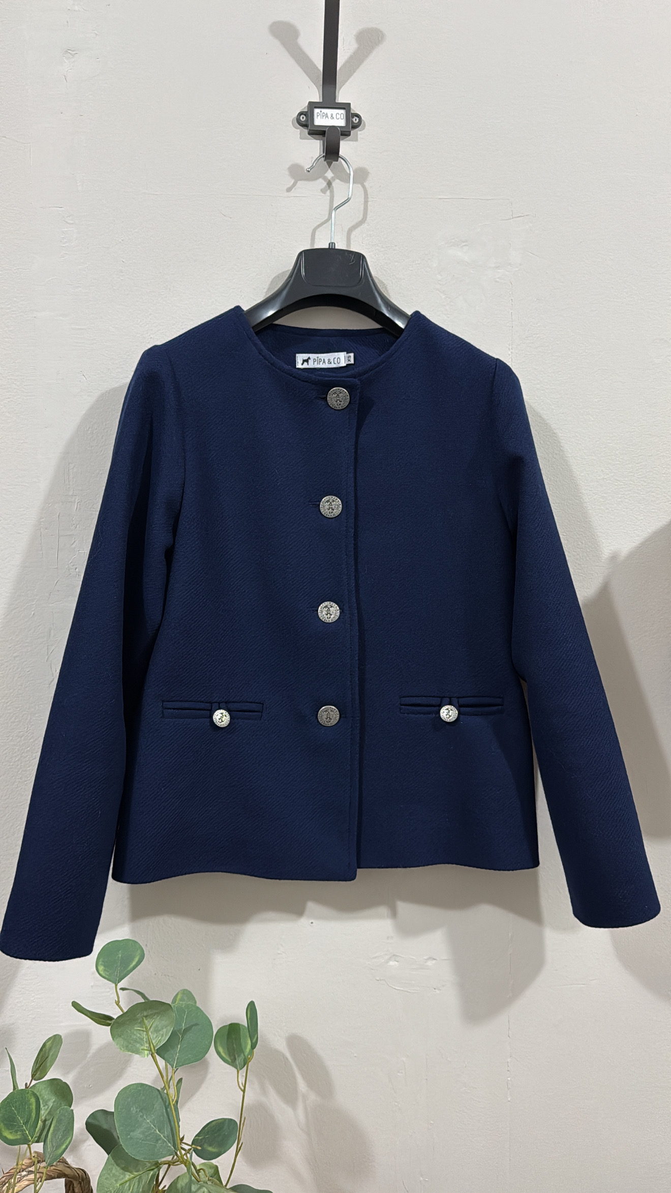 Chaqueta corta 100% lana Shetland azul.  Corte recto, cuello redondo , hombro encajado, botones metálicos plata . Bolsillos de ojal con presilla y botón.