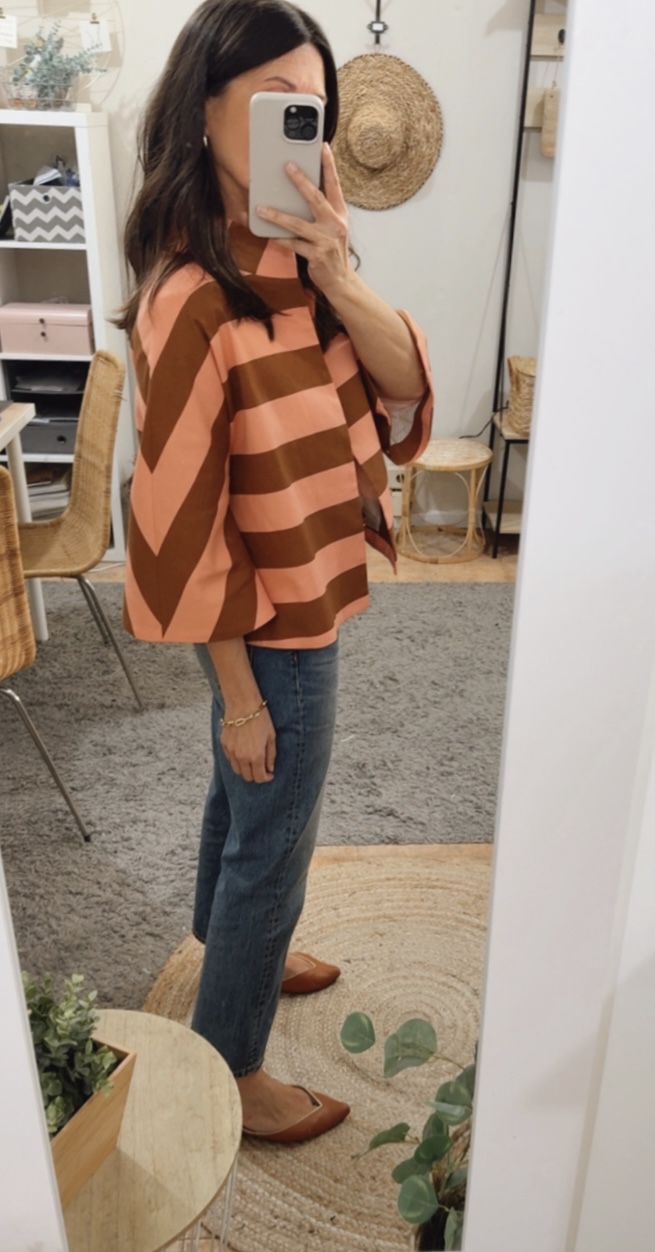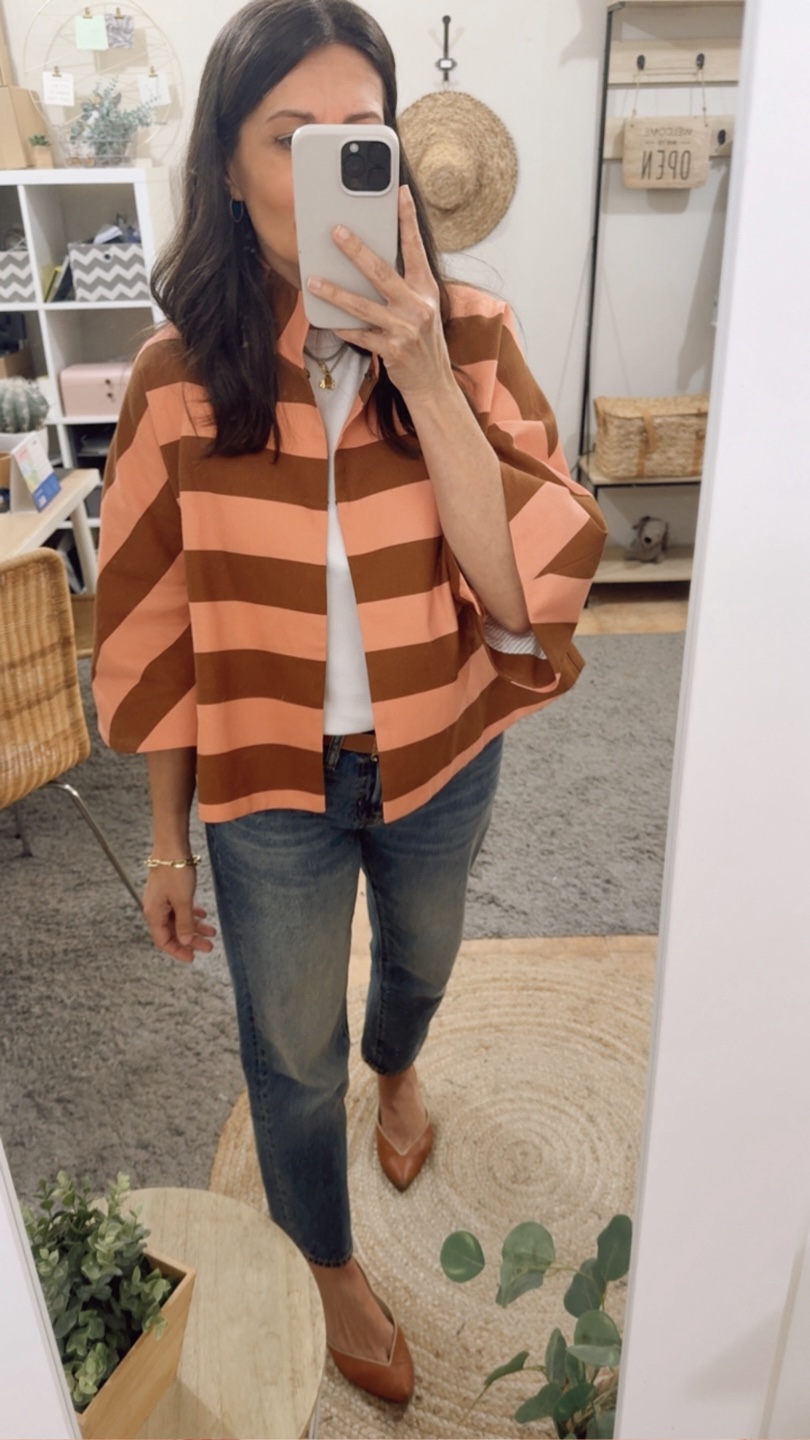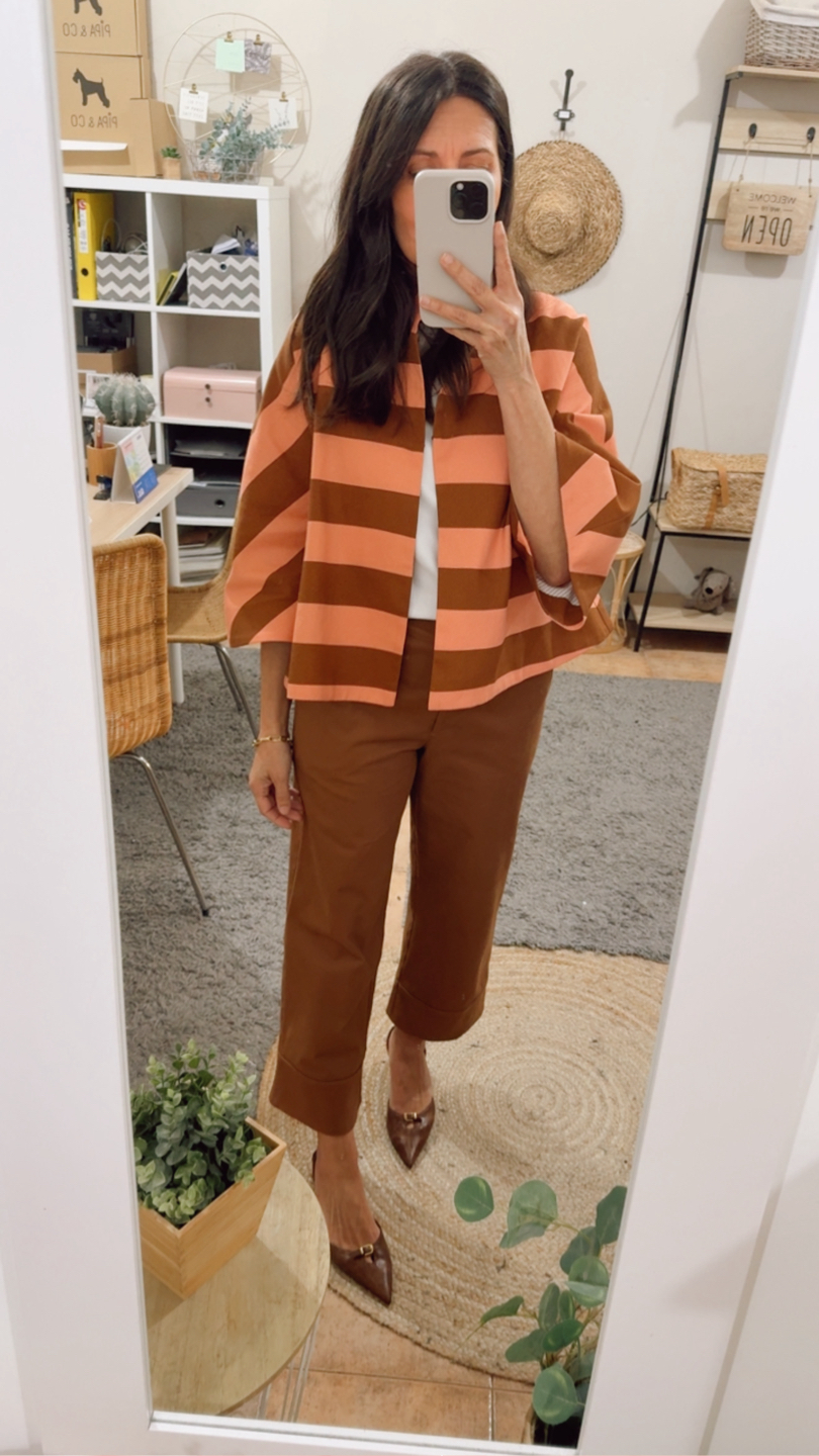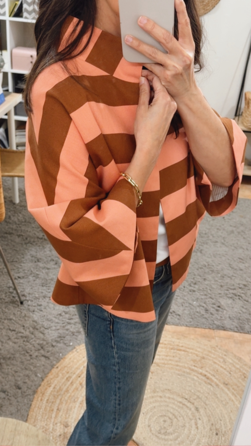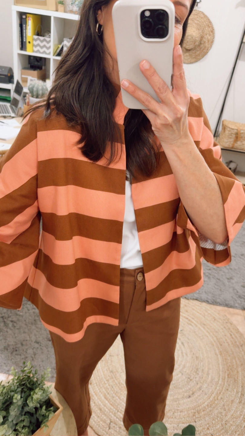 Chaqueta corta raya avellana/melocotón. Corte evasé, escote redondo con cuello chimenea. Manga francesa con corte evasé. Espalda con canesú y pliegue. Abrocha con corchetes. Forro interior.