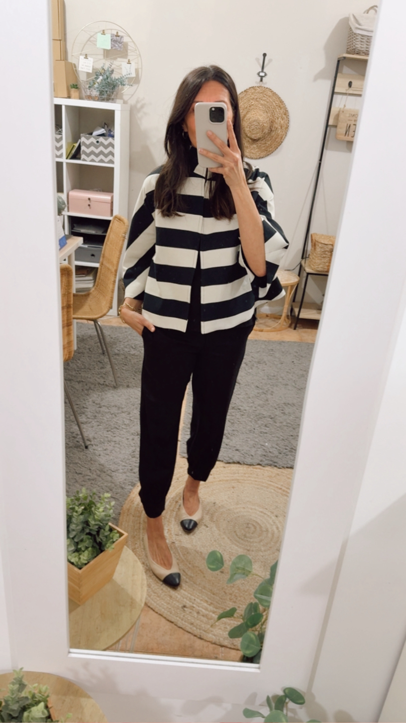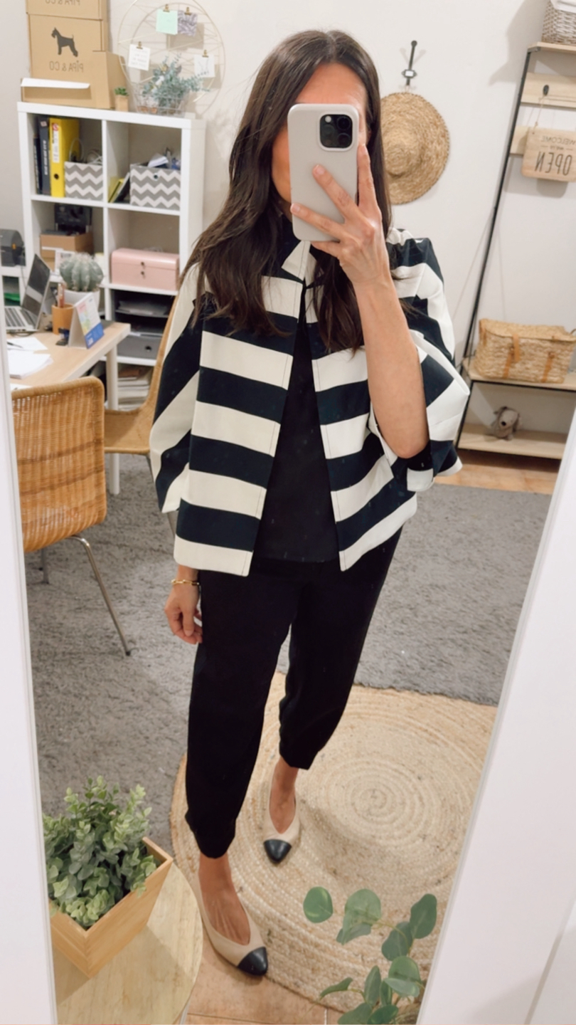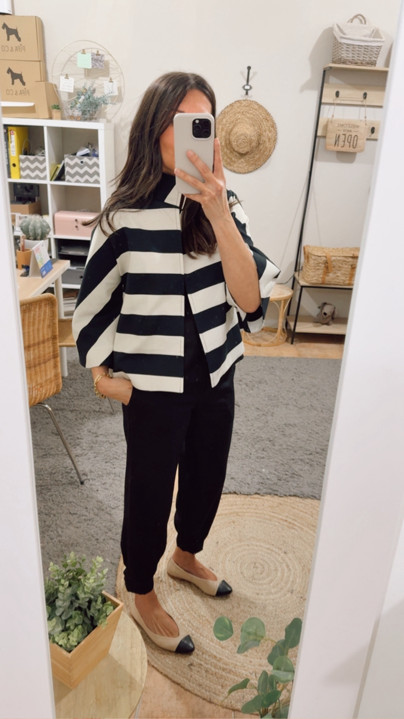 Chaqueta corta raya negra/blanco roto . Corte evasé, escote redondo con cuello chimenea. Manga francesa con corte evasé. Espalda con canesú y pliegue. Abrocha con corchetes. Forro interior.