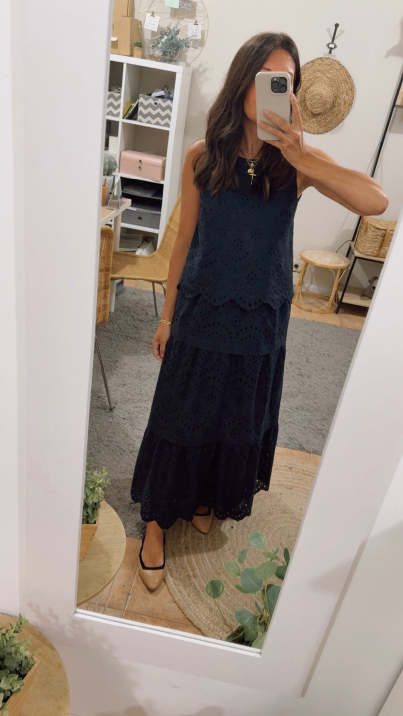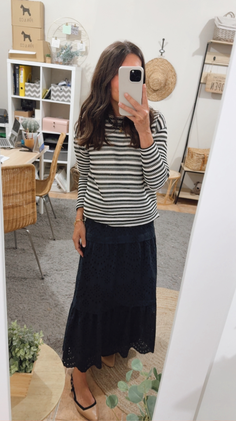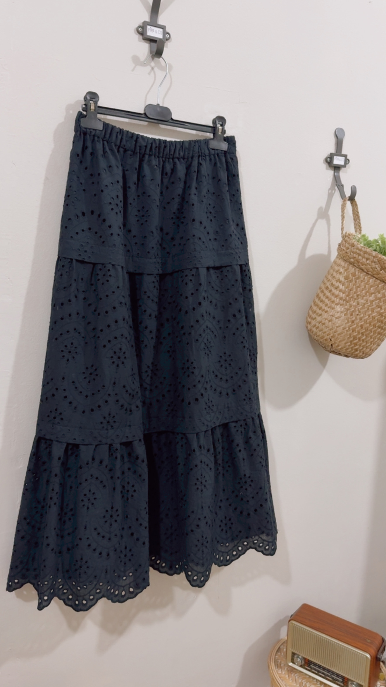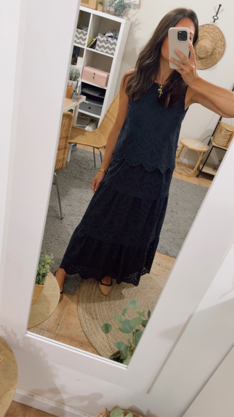 Falda larga negra 100% algodón bordado con diseño floral calado. Detalles lorzas entre cortes falda. Goma alrededor de toda la cintura. Forro interior negro.