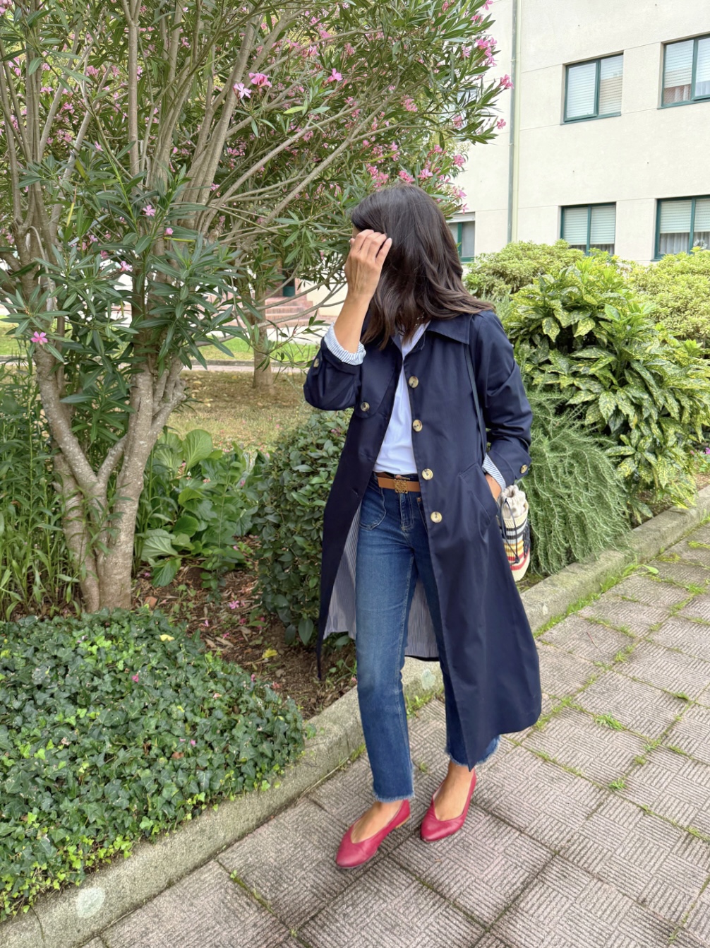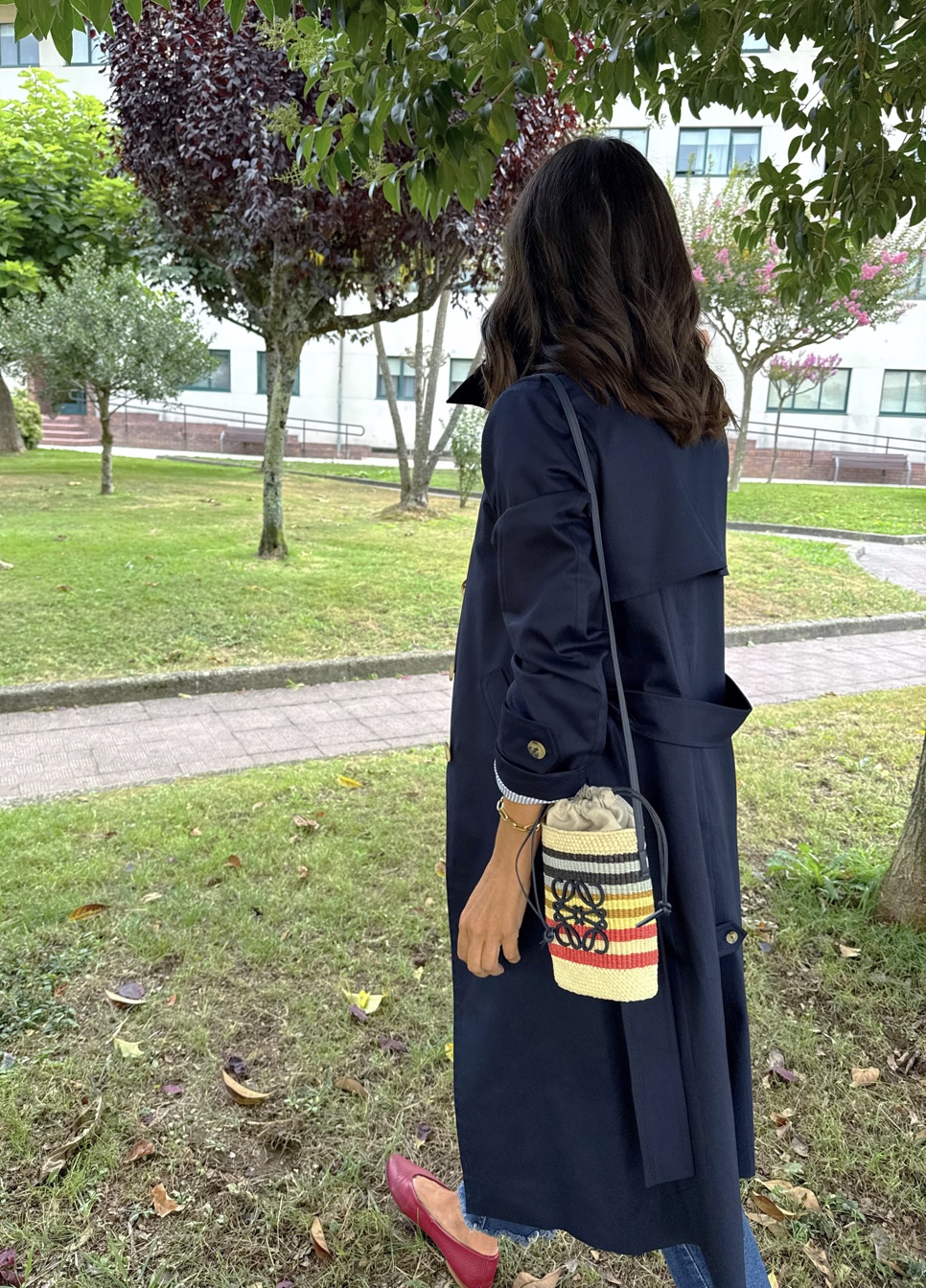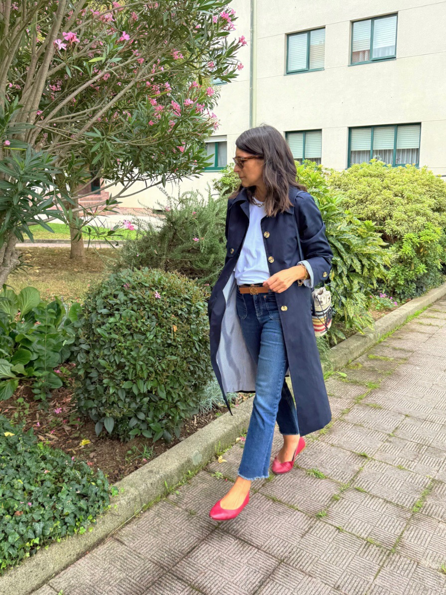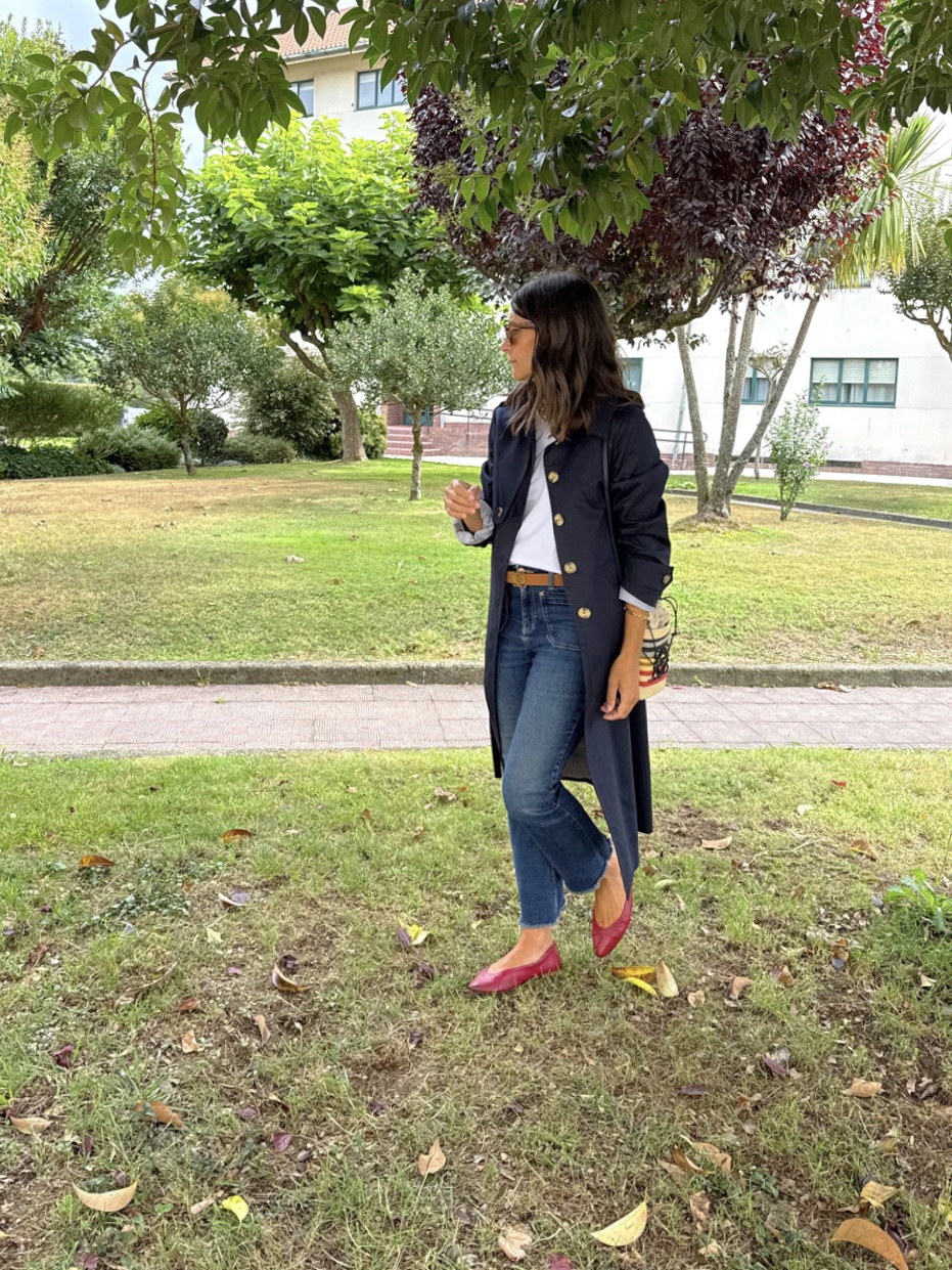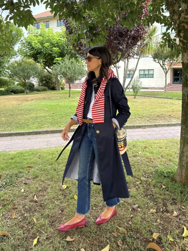 Gabardina azul marino , corte recto, cuello camisero . Botonadura simple, bolsillos con tapeta , charreteras en hombros, trabillas en mangas, capacete delantero y espalda, cinturón. Amplia abertura trasera. Forro interior en rayas azules.