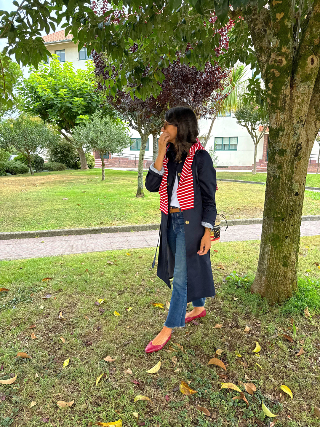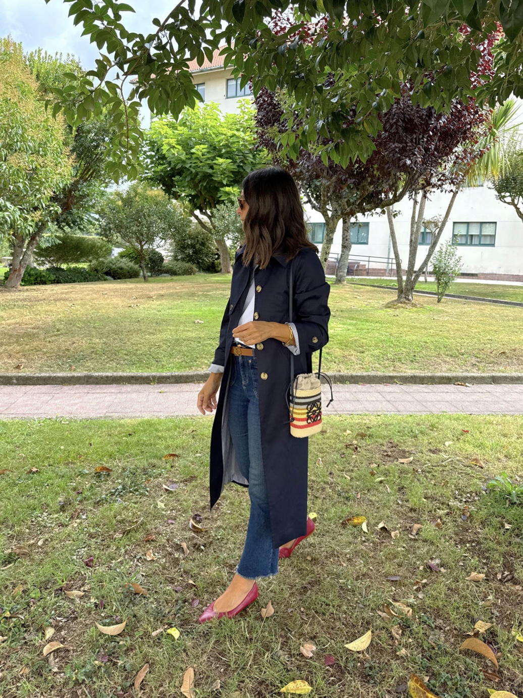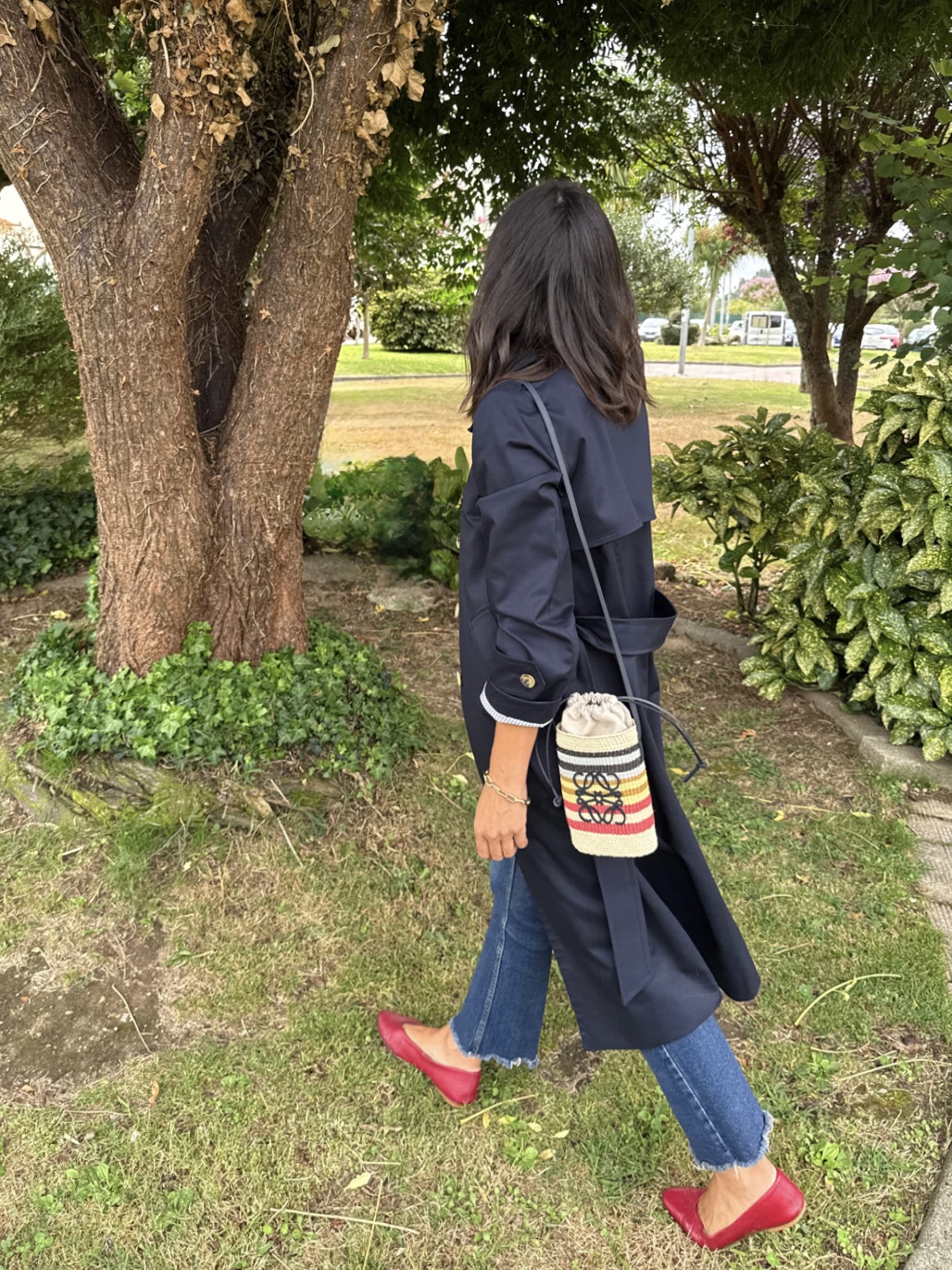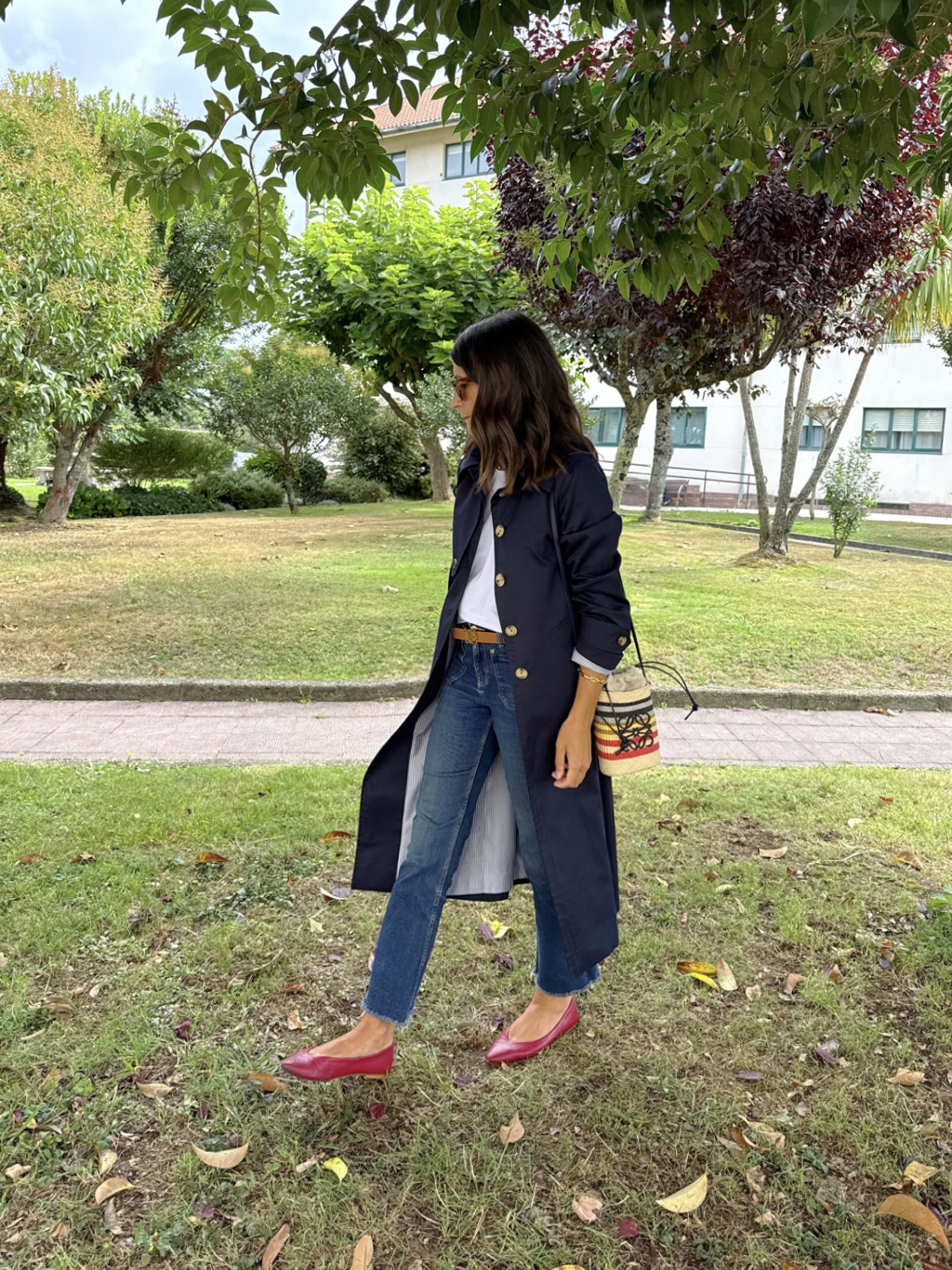 Gabardina azul marino , corte recto, cuello camisero . Botonadura simple, bolsillos con tapeta , charreteras en hombros, trabillas en mangas, capacete delantero y espalda, cinturón. Amplia abertura trasera. Forro interior en rayas azules.