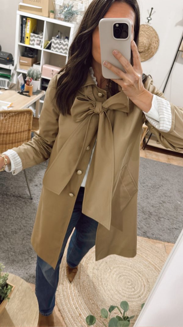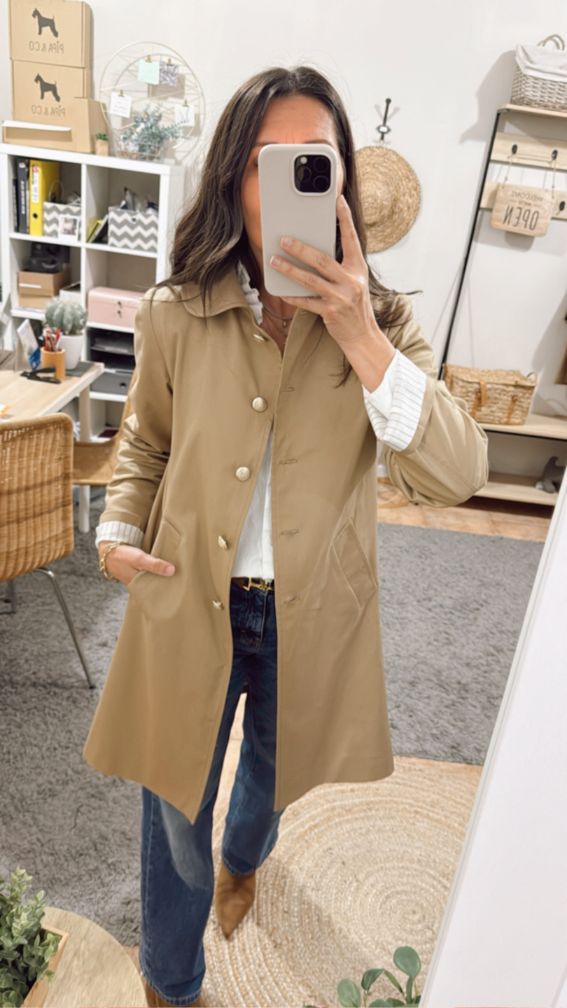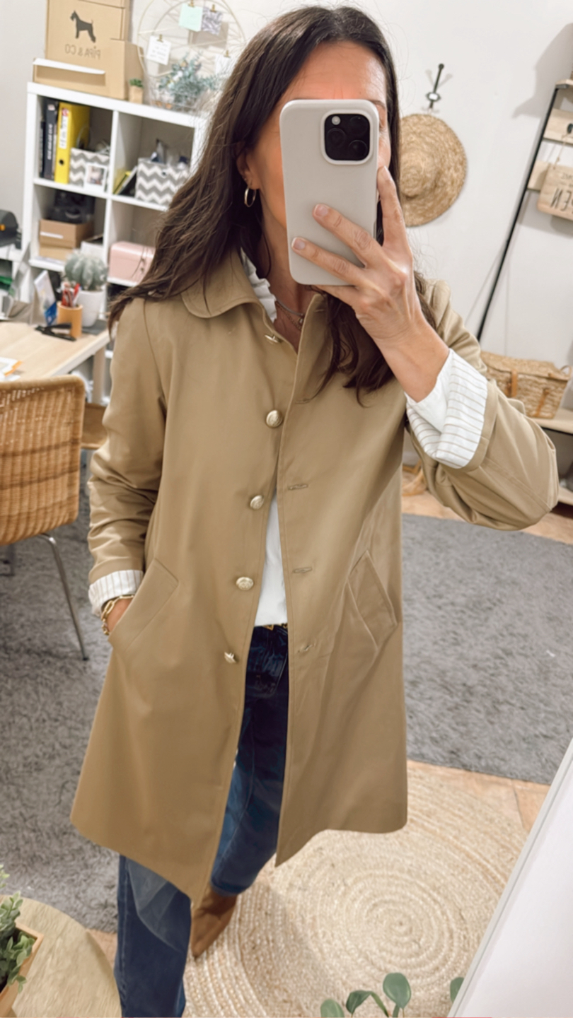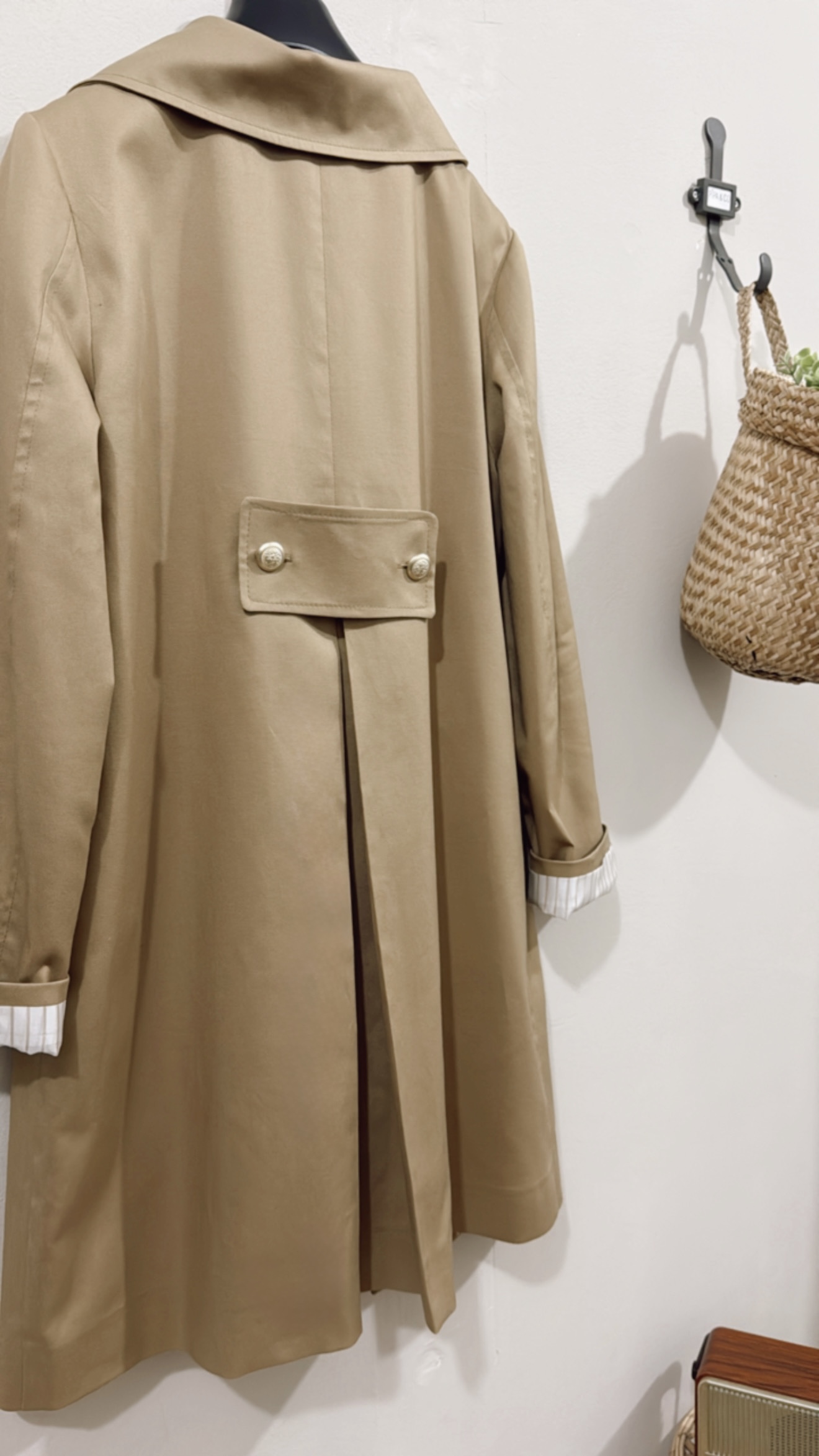 Gabardina sarga cámel . Corte ligeramente trapecio, escote redondo con cuello bebé. Botonadura simple , bolsillos delanteros con tapeta, pliegue profundo en espada con trabilla y botones. Botones de metal marineros dorados. Forro rayas arena.