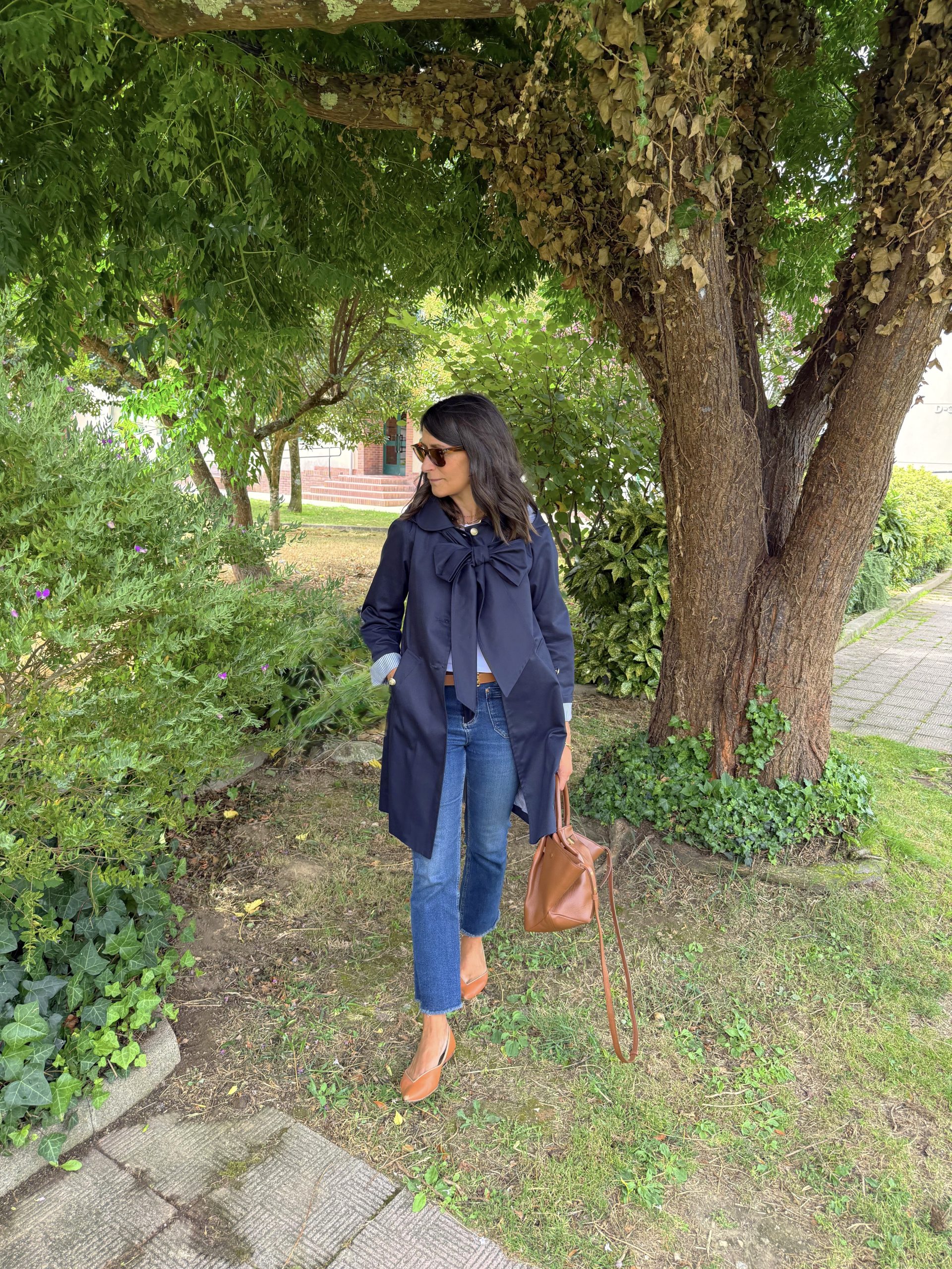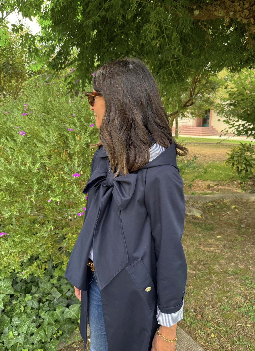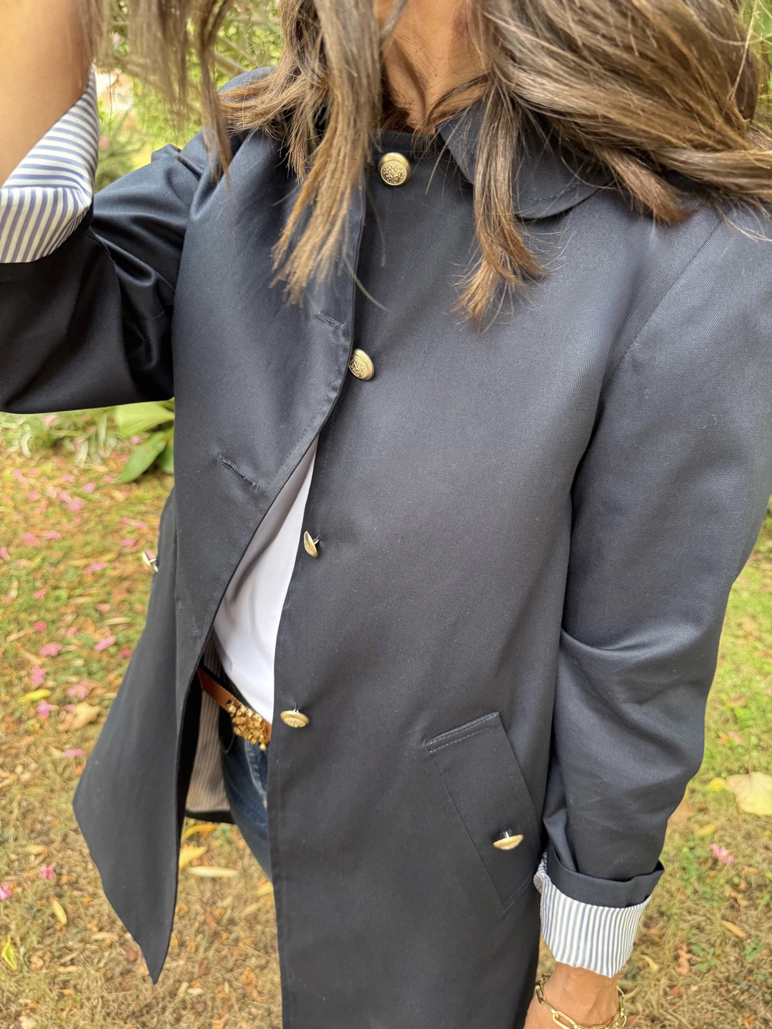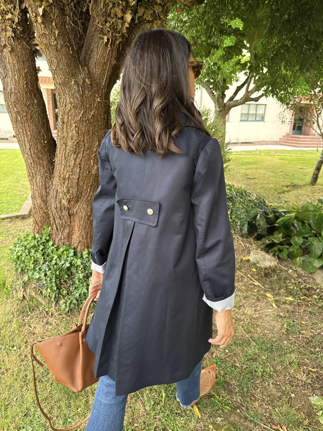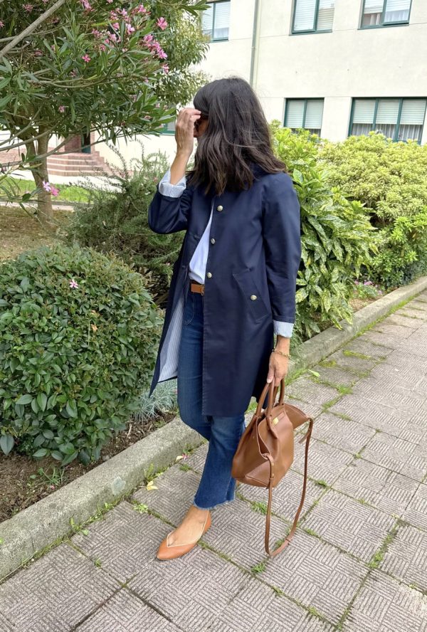 Gabardina sarga azul marino . Corte ligeramente trapecio, escote redondo con cuello bebé. Botonadura simple , bolsillos delanteros con tapeta, pliegue profundo en espada con trabilla y botones. Botones de metal marineros dorados. Forro rayas azul.