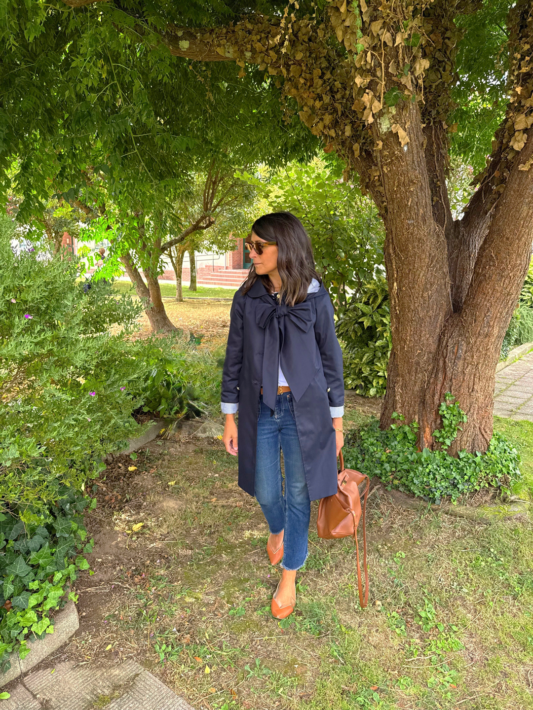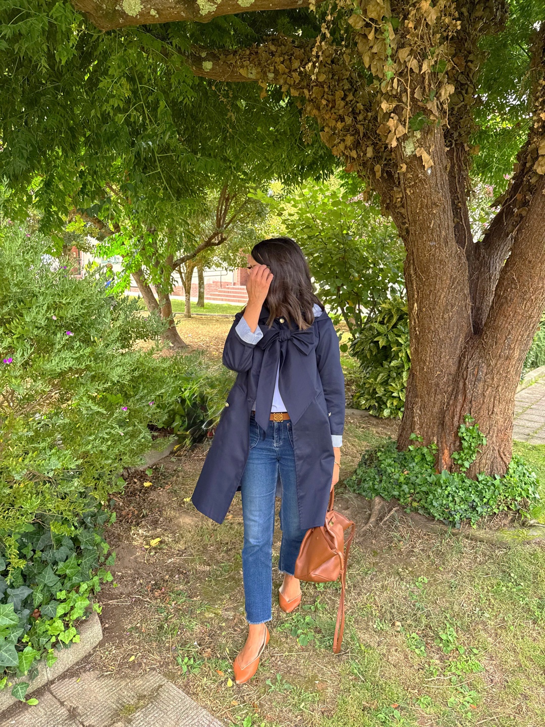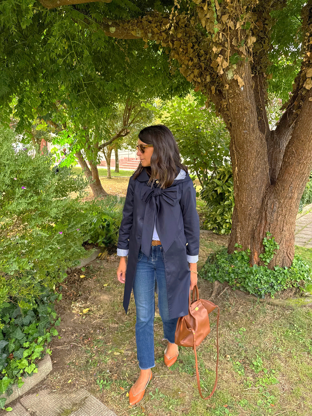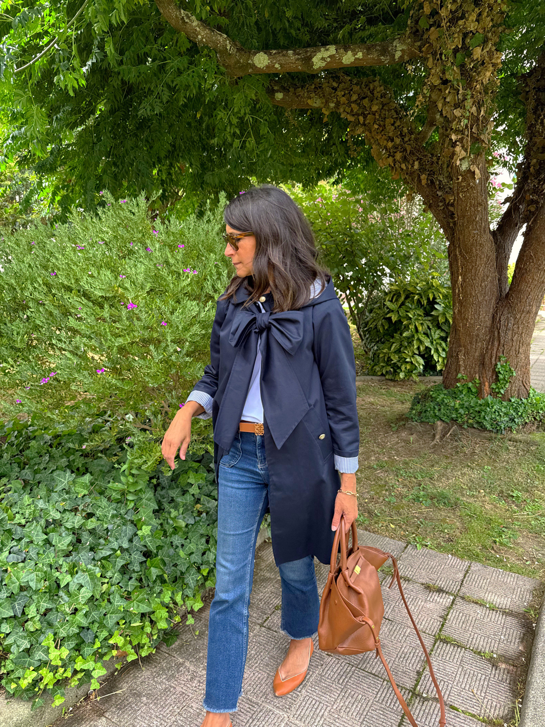 Gabardina sarga azul marino . Corte ligeramente trapecio, escote redondo con cuello bebé. Botonadura simple , bolsillos delanteros con tapeta, pliegue profundo en espada con trabilla y botones. Botones de metal marineros dorados. Forro rayas azul.