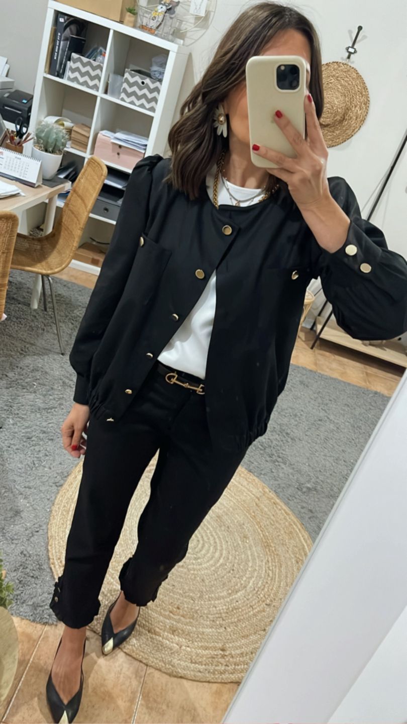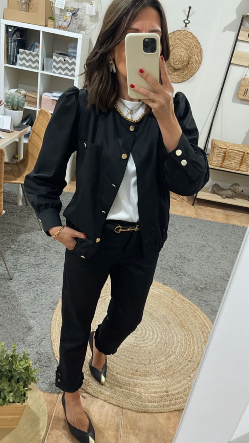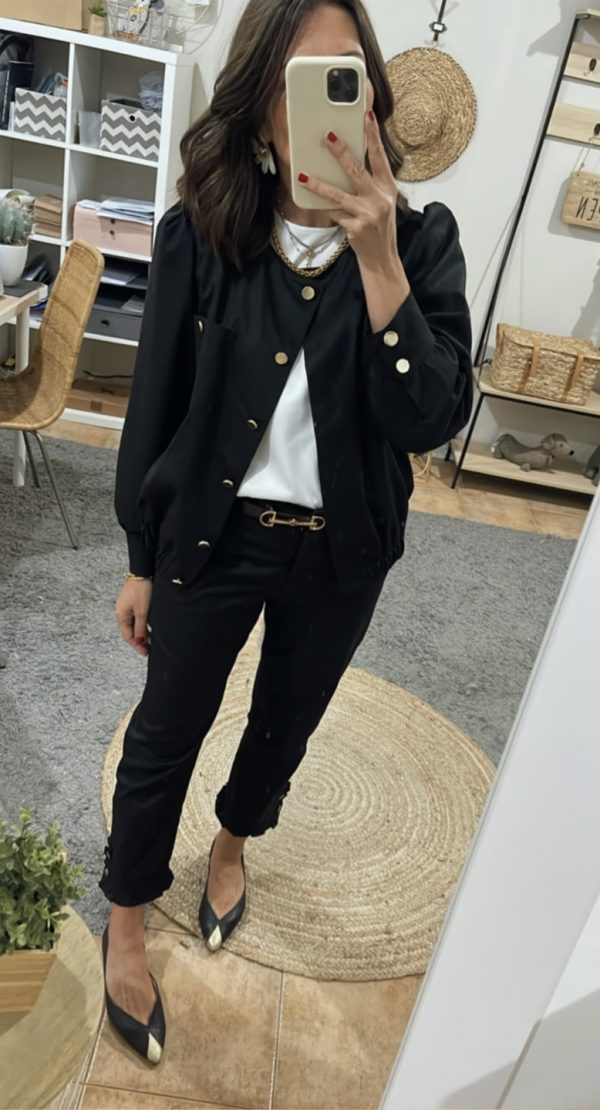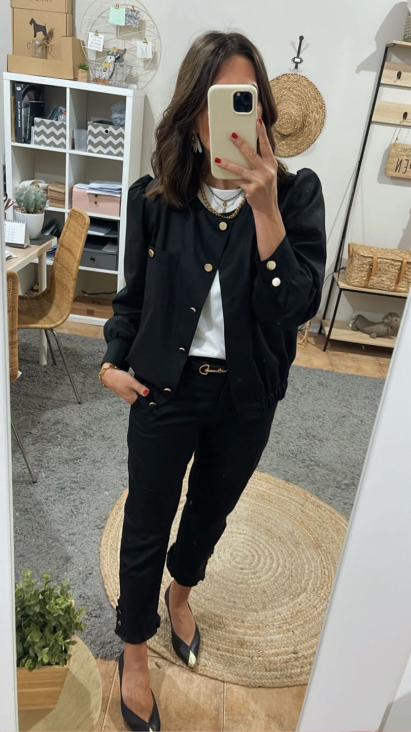 Pantalón tobillero negro . Tiro medio, pierna recta estrecha, cintura con botón, cremallera delantera, bolsillos laterales, pinzas debajo cintura espalda. Pequeño volante fruncido en bajo pierna con detalle de botones.