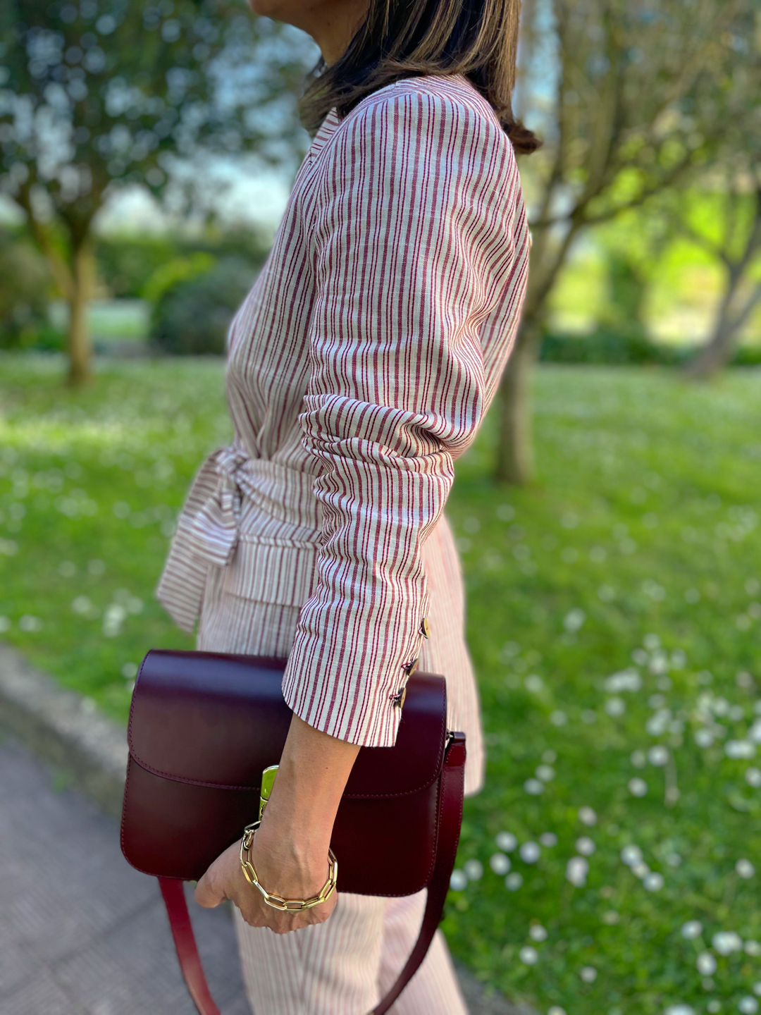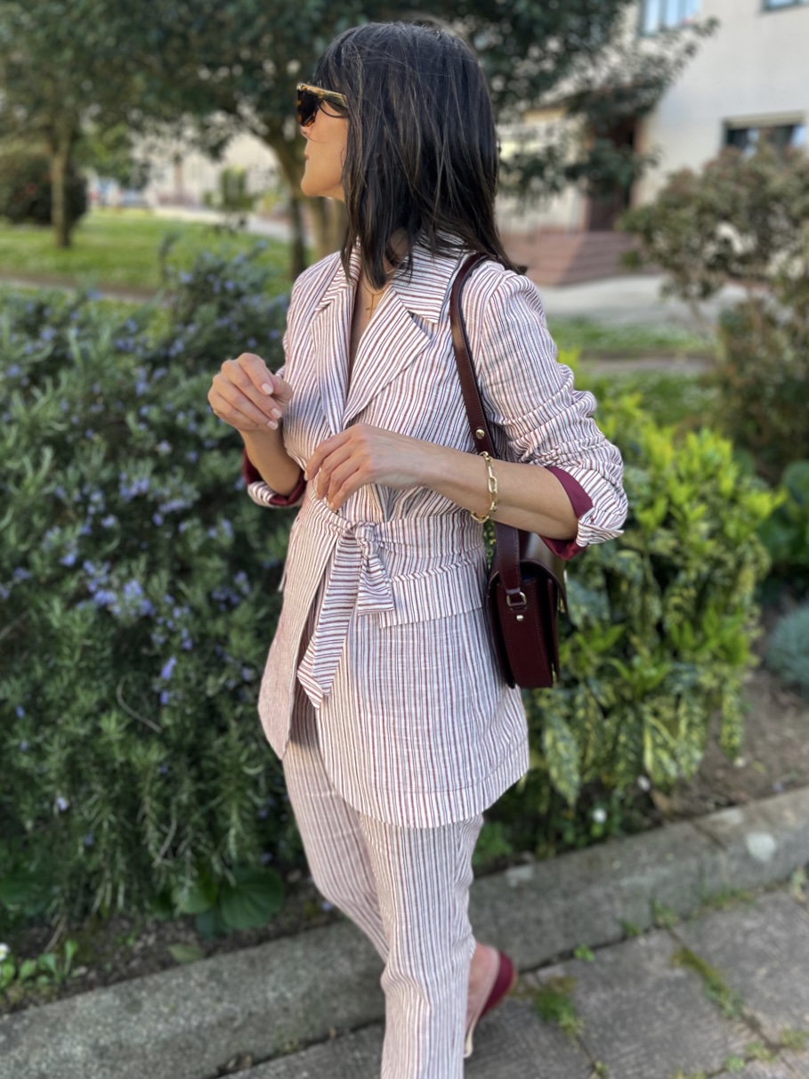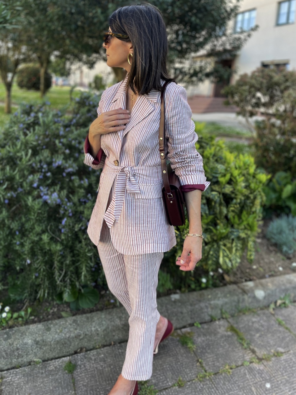 Pantalón tobillero lino rayas granate/blanco roto . Tiro medio, pierna recta estrecha, cintura con botón, cremallera delantera, bolsillos laterales, pinzas debajo cintura espalda.