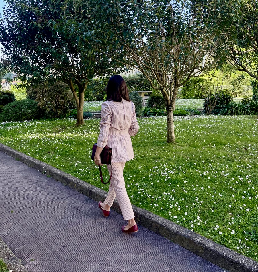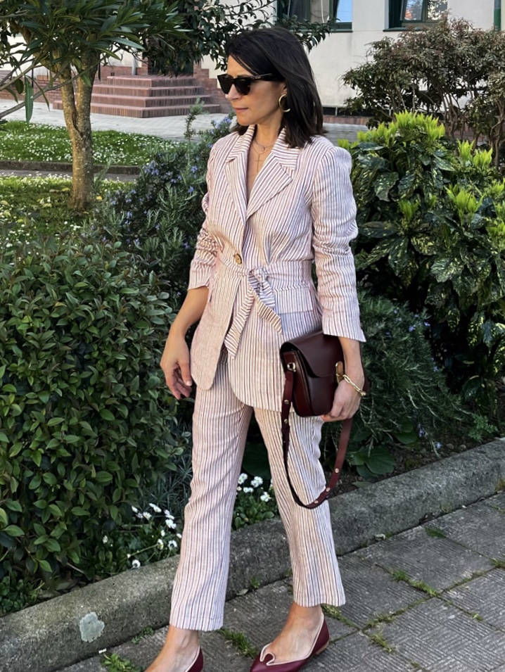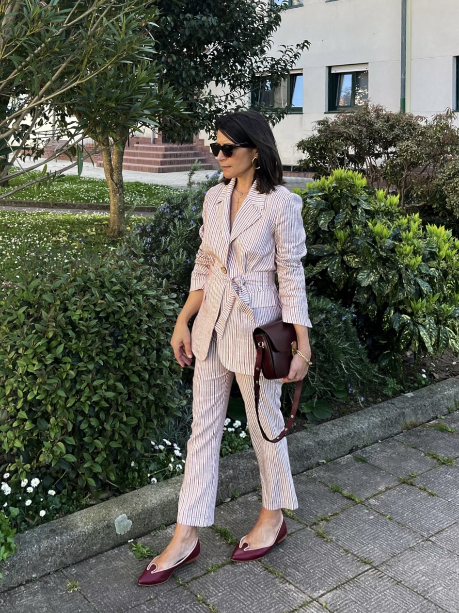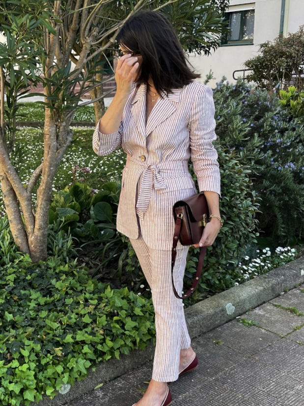 Pantalón tobillero lino rayas granate/blanco roto . Tiro medio, pierna recta estrecha, cintura con botón, cremallera delantera, bolsillos laterales, pinzas debajo cintura espalda.