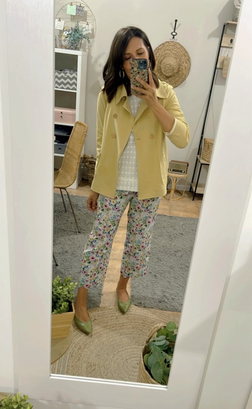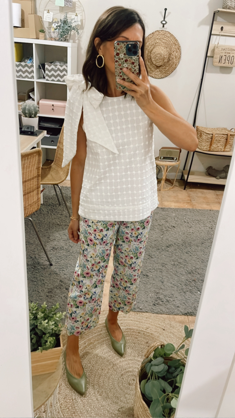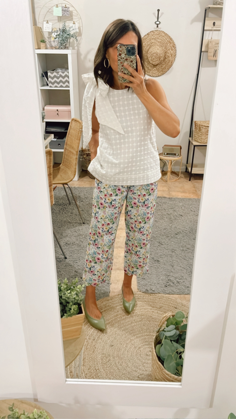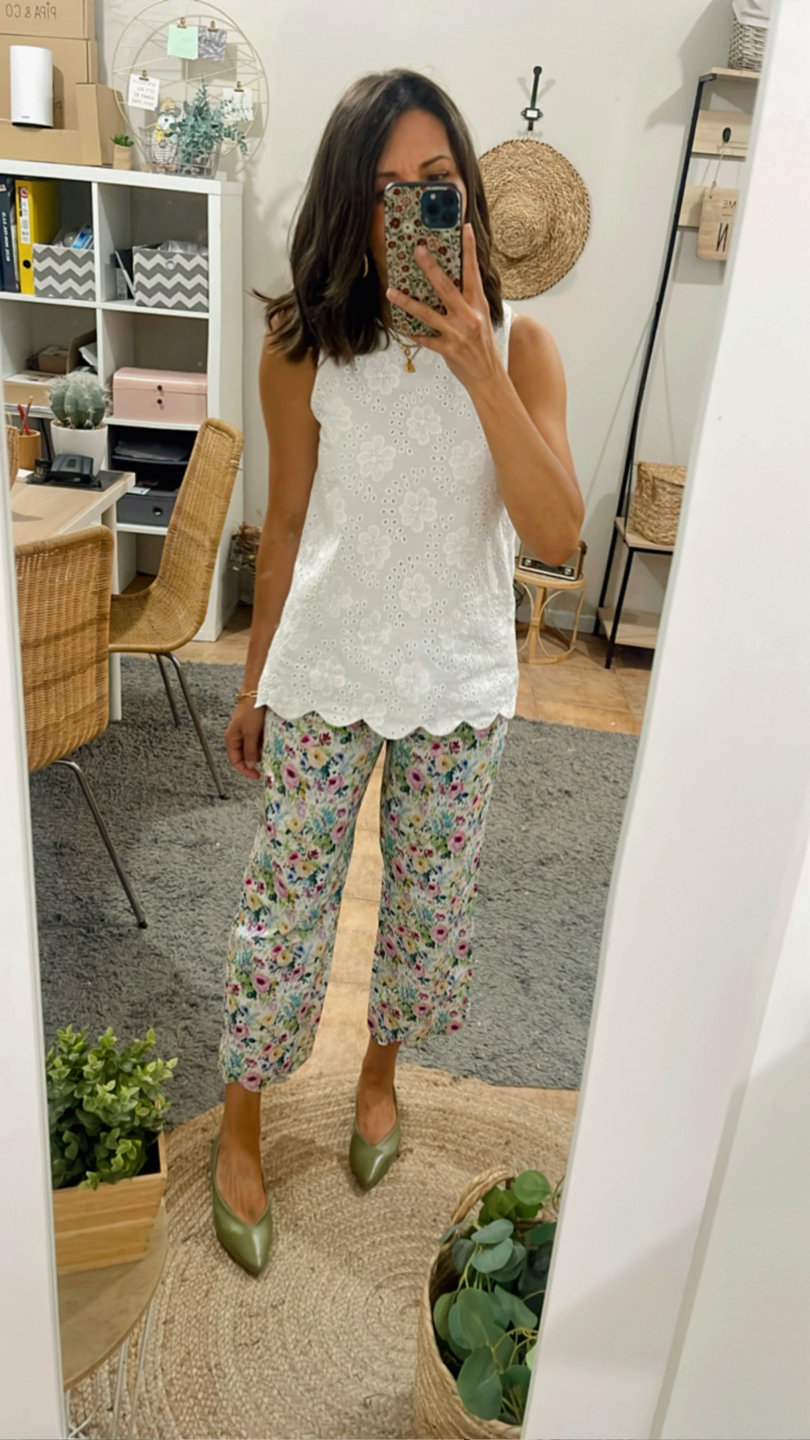 Pantalón tobillero estampado .Tiro medio, pierna recta, bajo con cenefa en ondas, cintura con goma. Bolsillos laterales.
