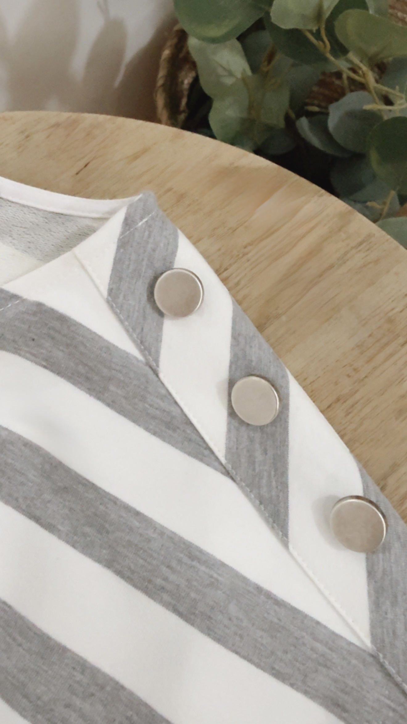 Sudadera entretiempo color gris con raya blanca. Tejido french terry . Escote barco, corte oversize, hombro caído con tapeta y botones plateados.