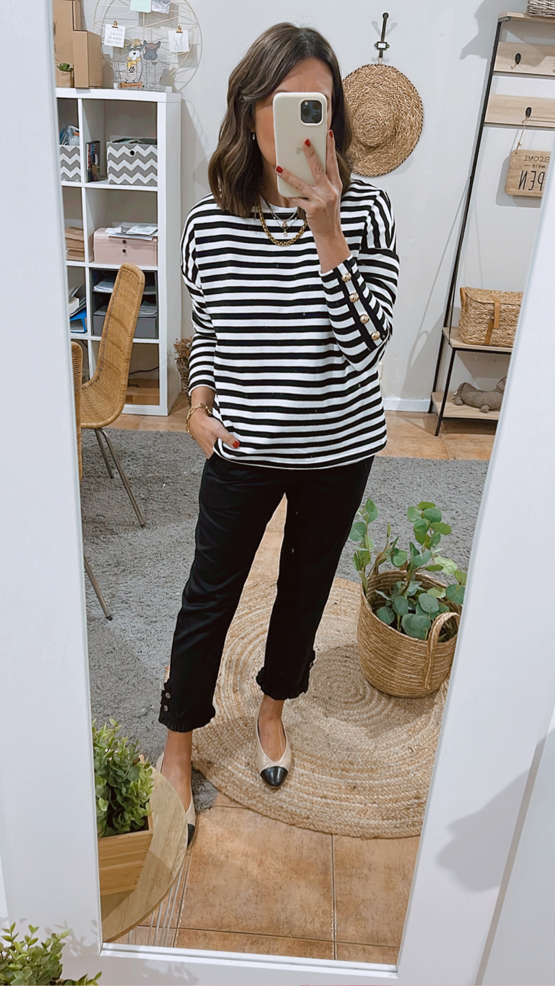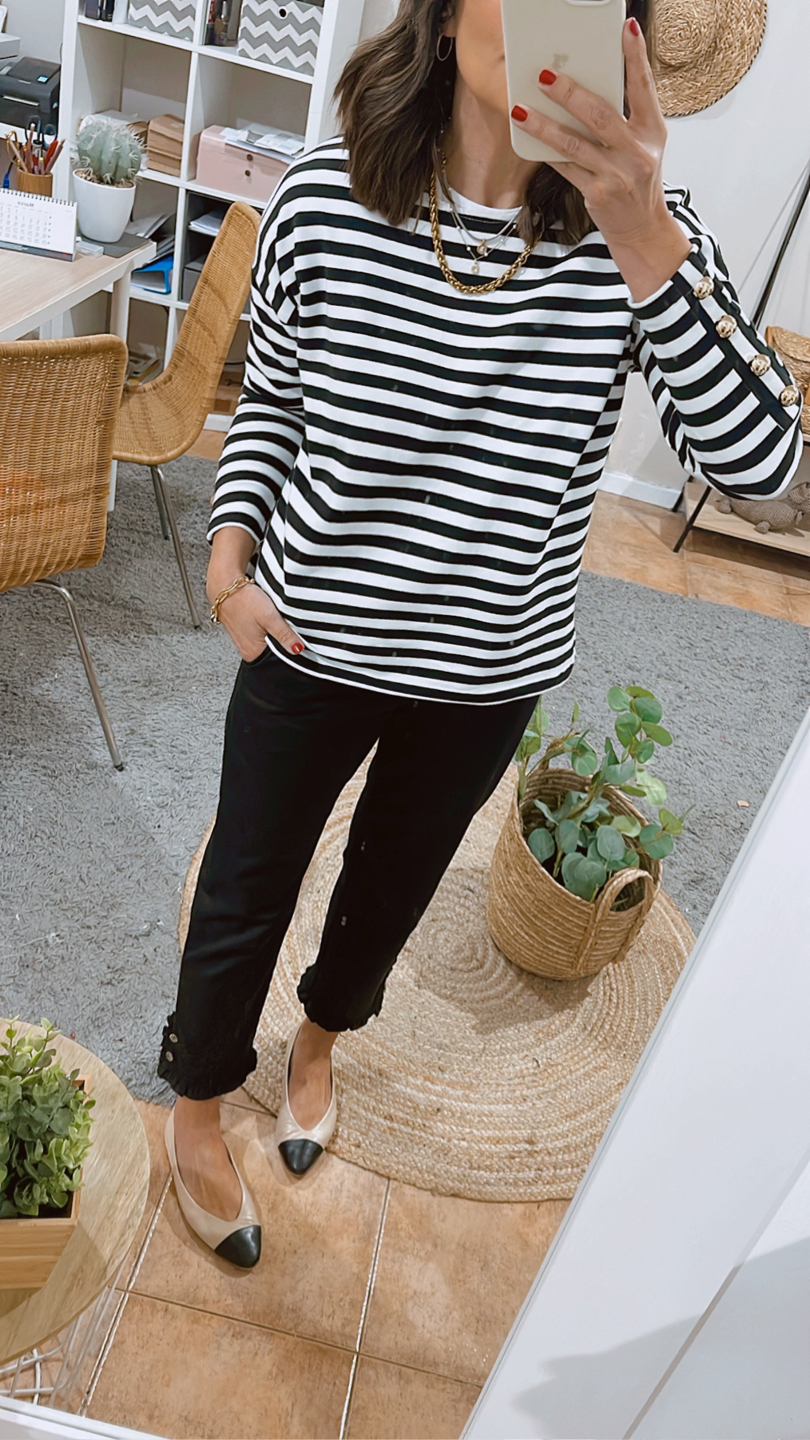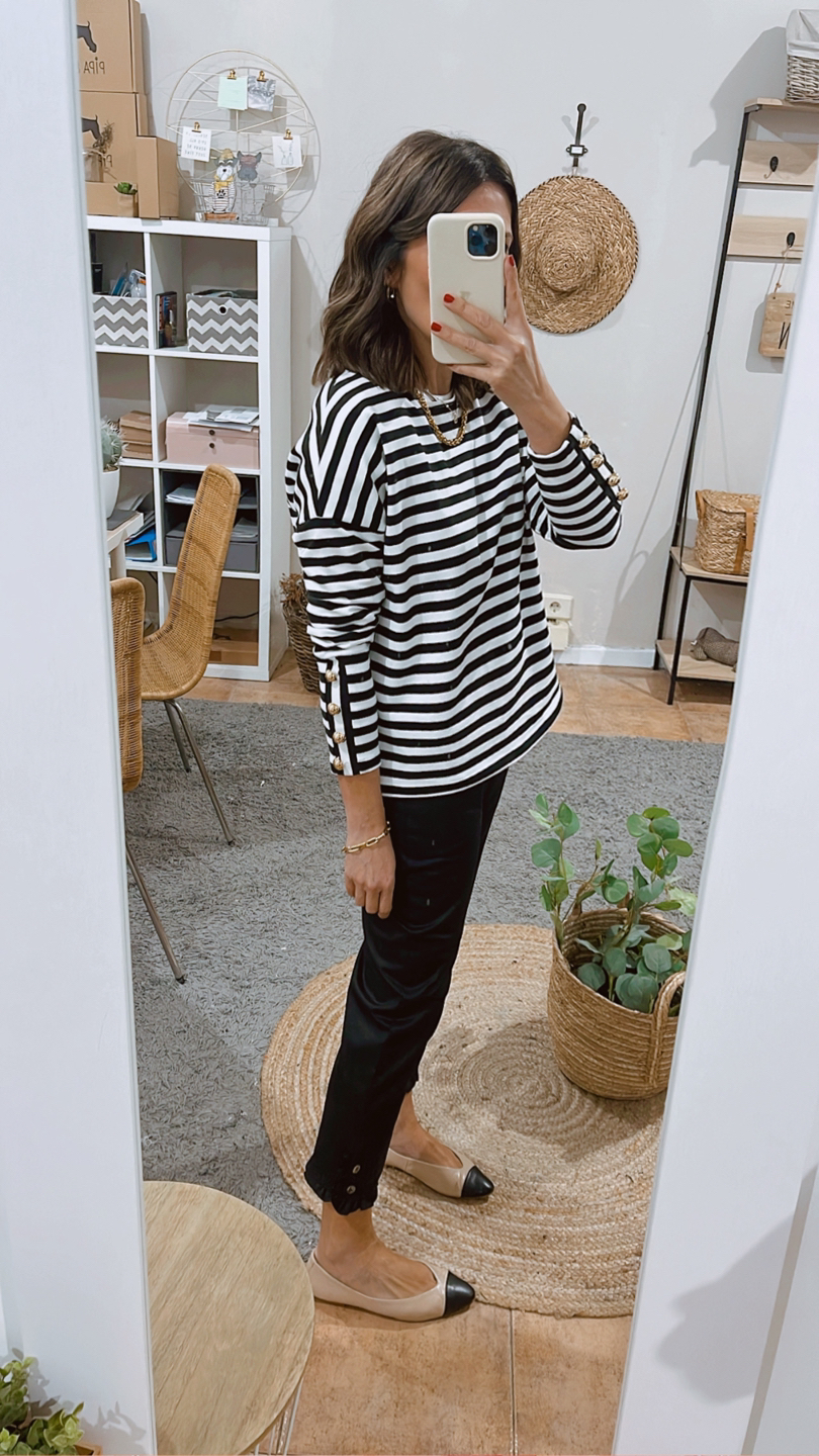 Camiseta entretiempo color negro con raya blanca . Escote barco, corte oversize, hombro caído, manga ajustada con tapeta y botones dorados.