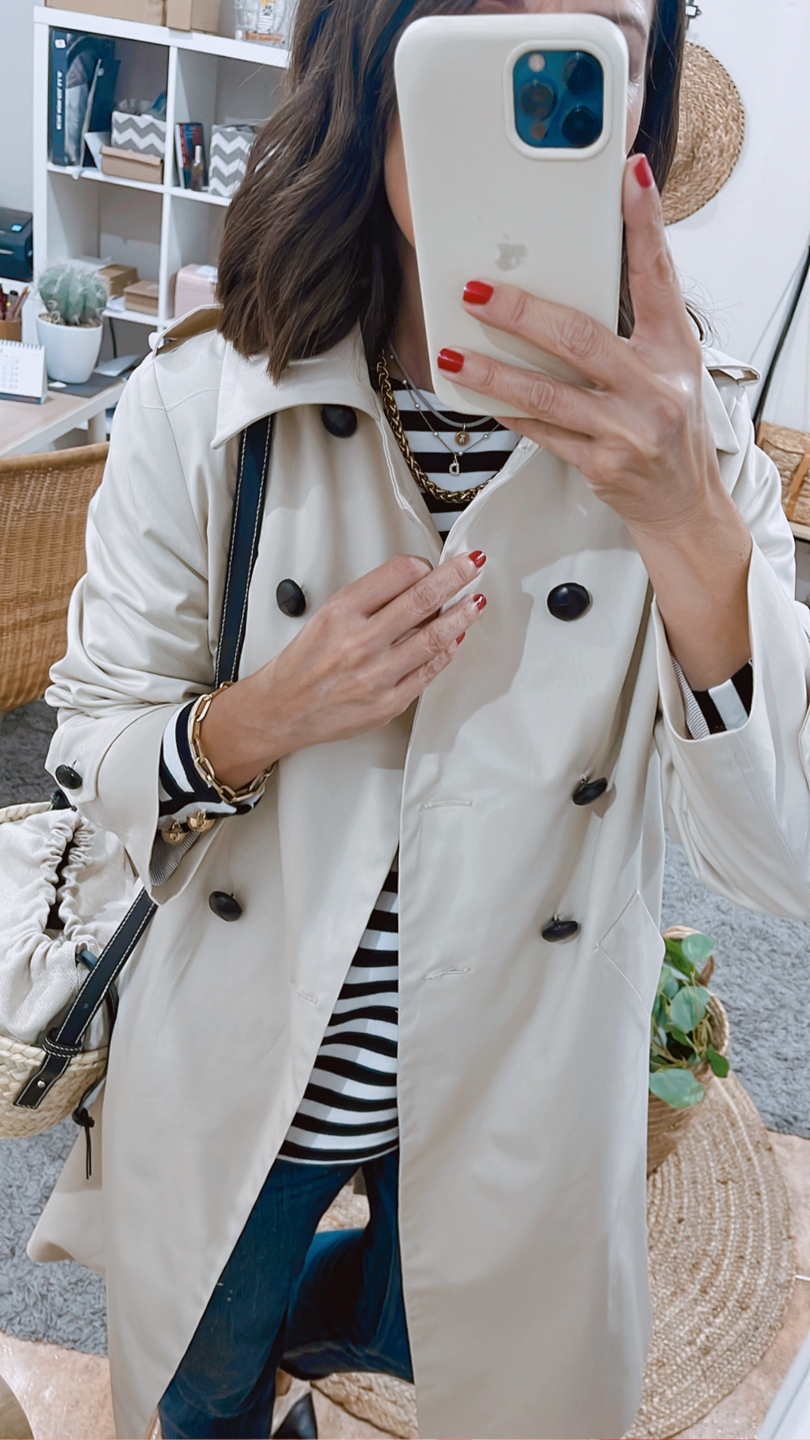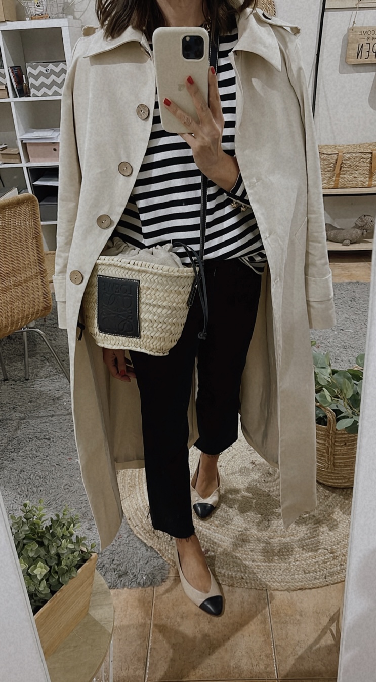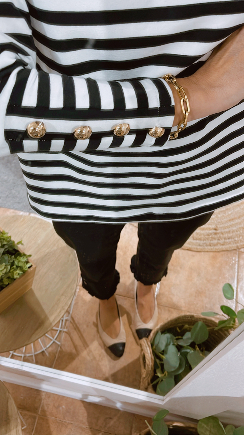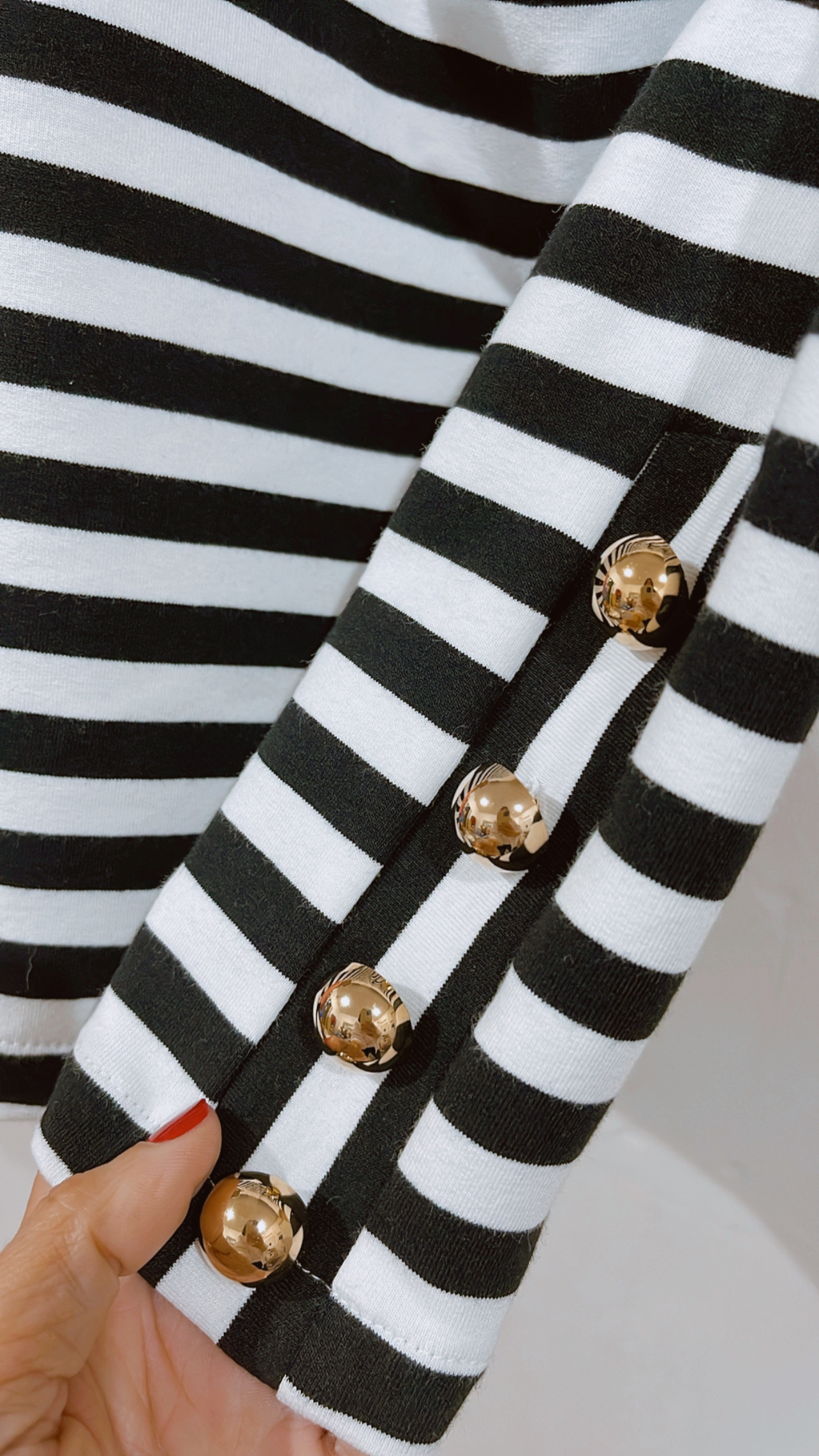 Camiseta entretiempo color negro con raya blanca . Escote barco, corte oversize, hombro caído, manga ajustada con tapeta y botones dorados.