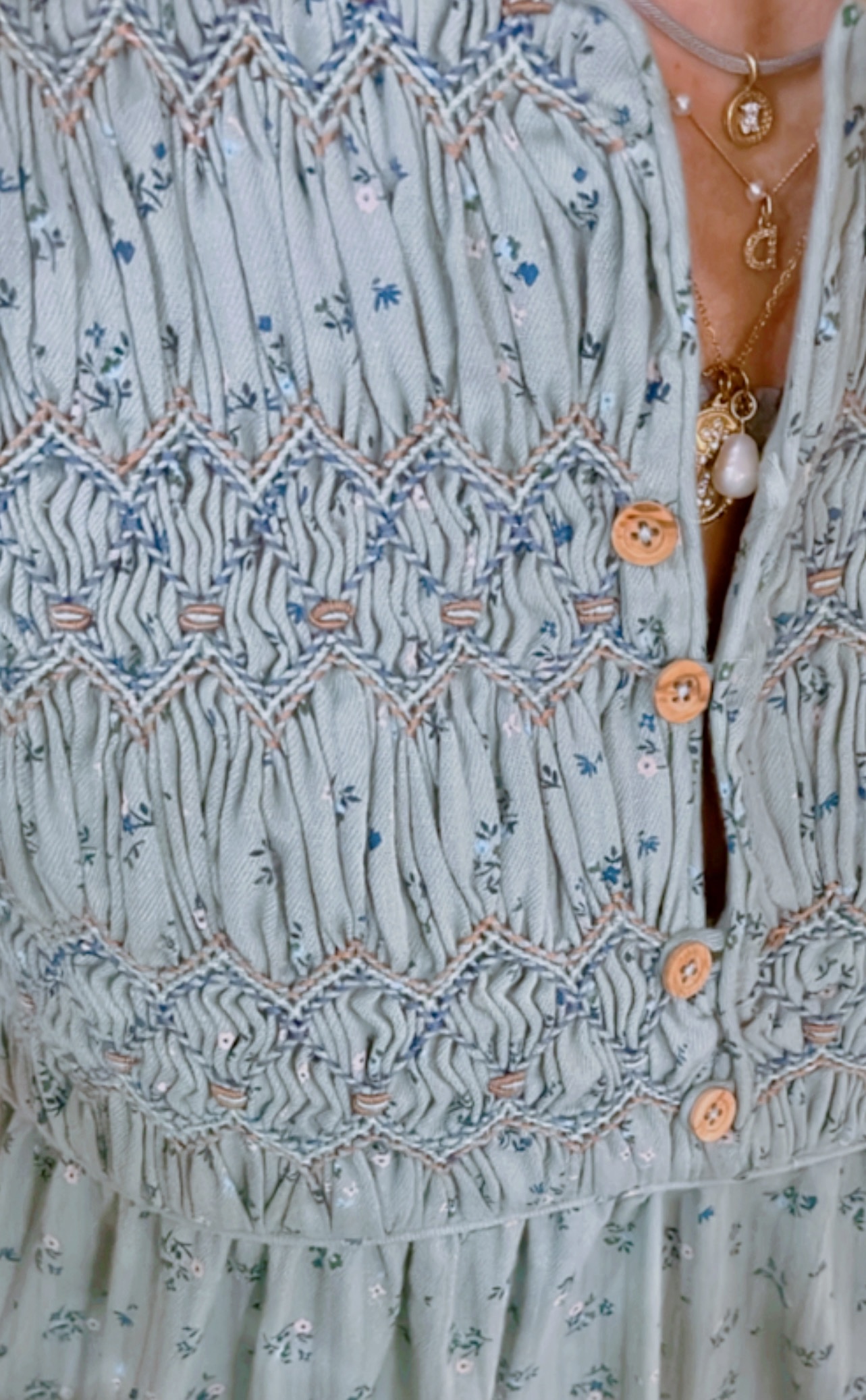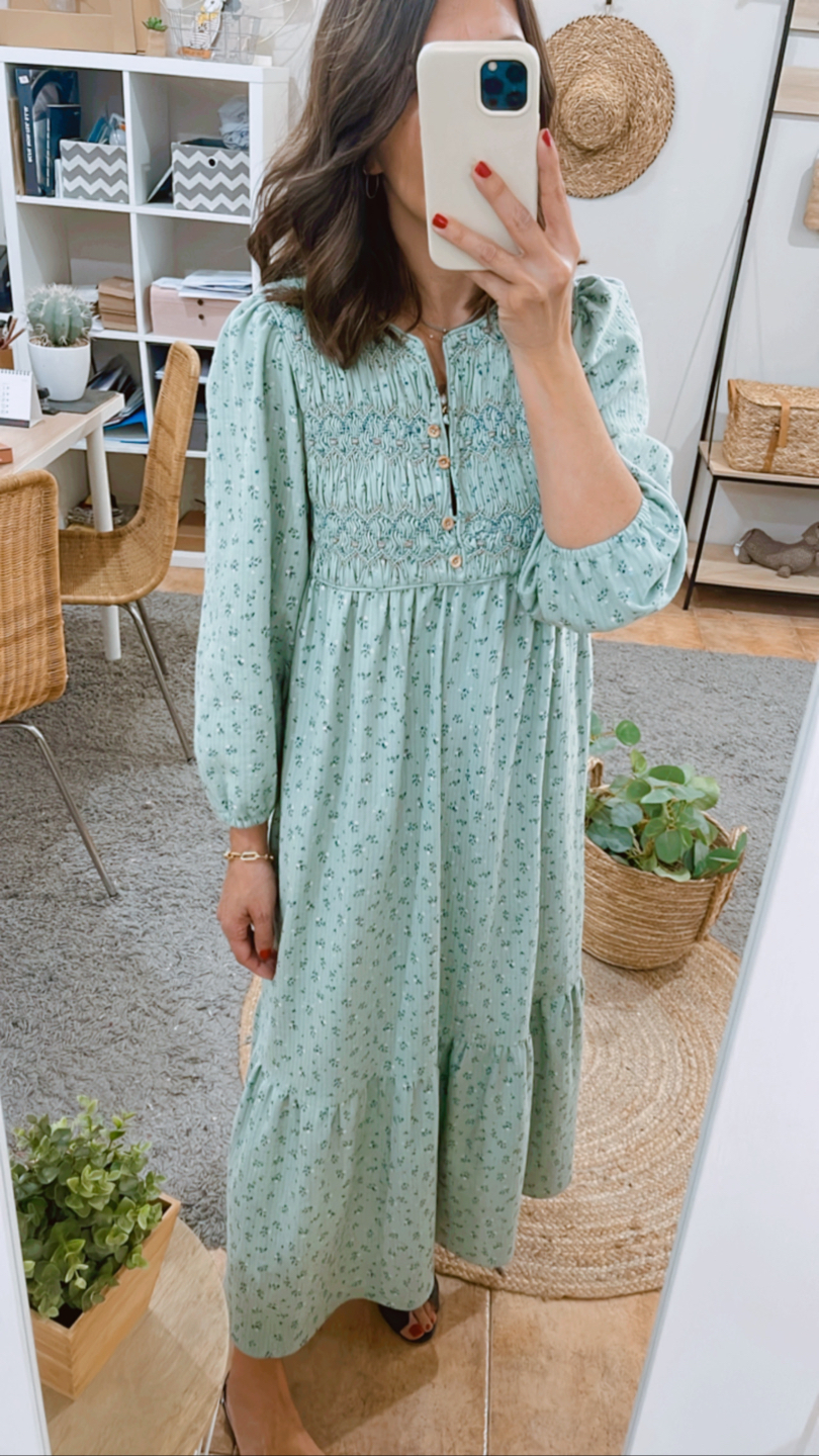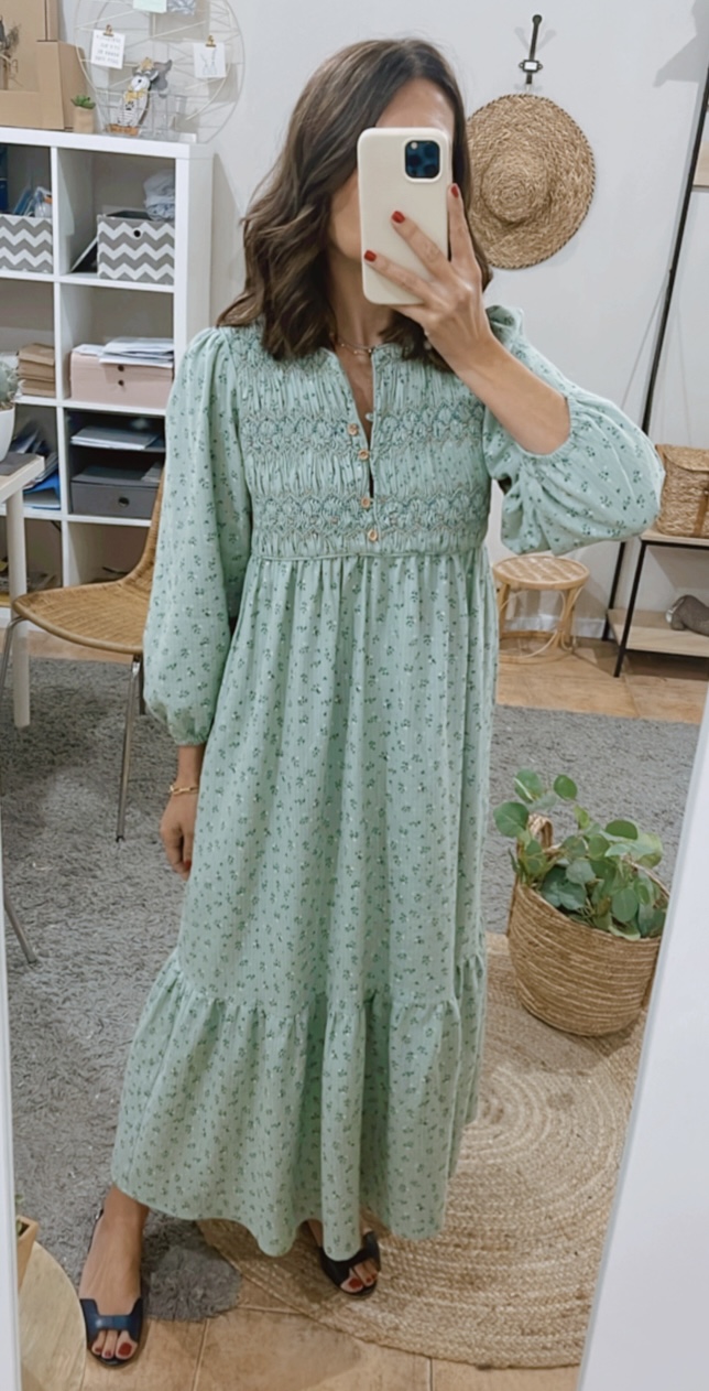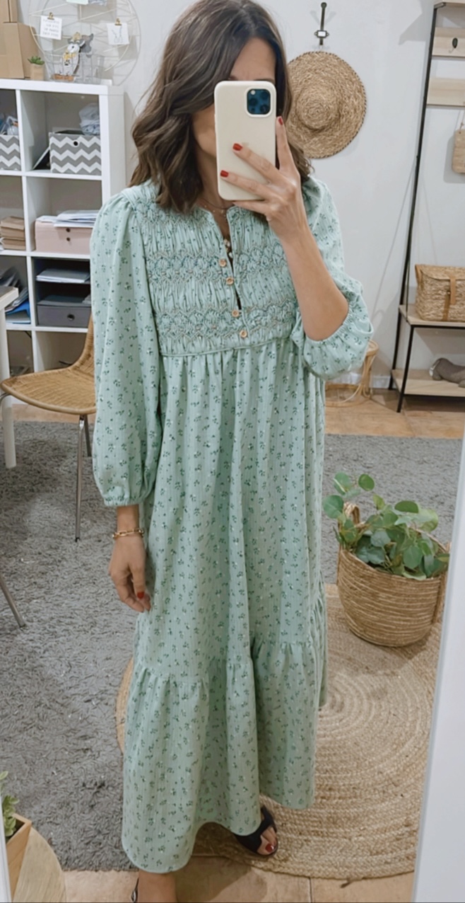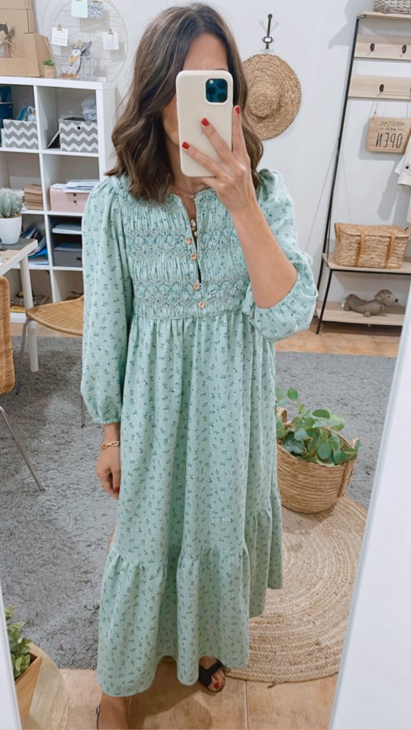 Vestido largo estampado fondo verde agua. Capacete bordado a mano nido abeja con rococós. Escote redondo, abertura delantera que cierra con presillas y botones de madera.Amplio volante fruncido en bajo. Bolsillos en costura lateral.