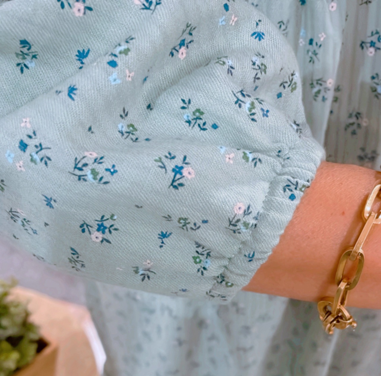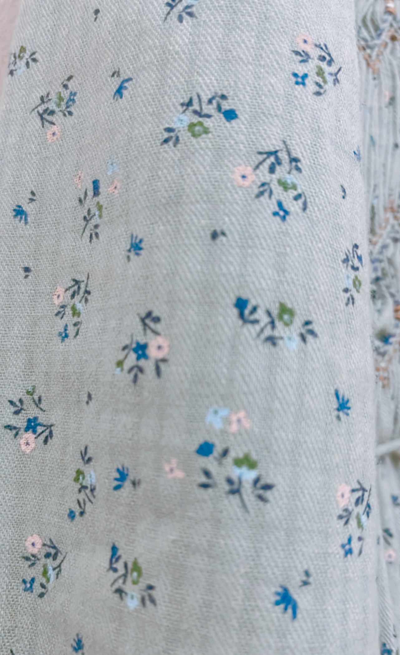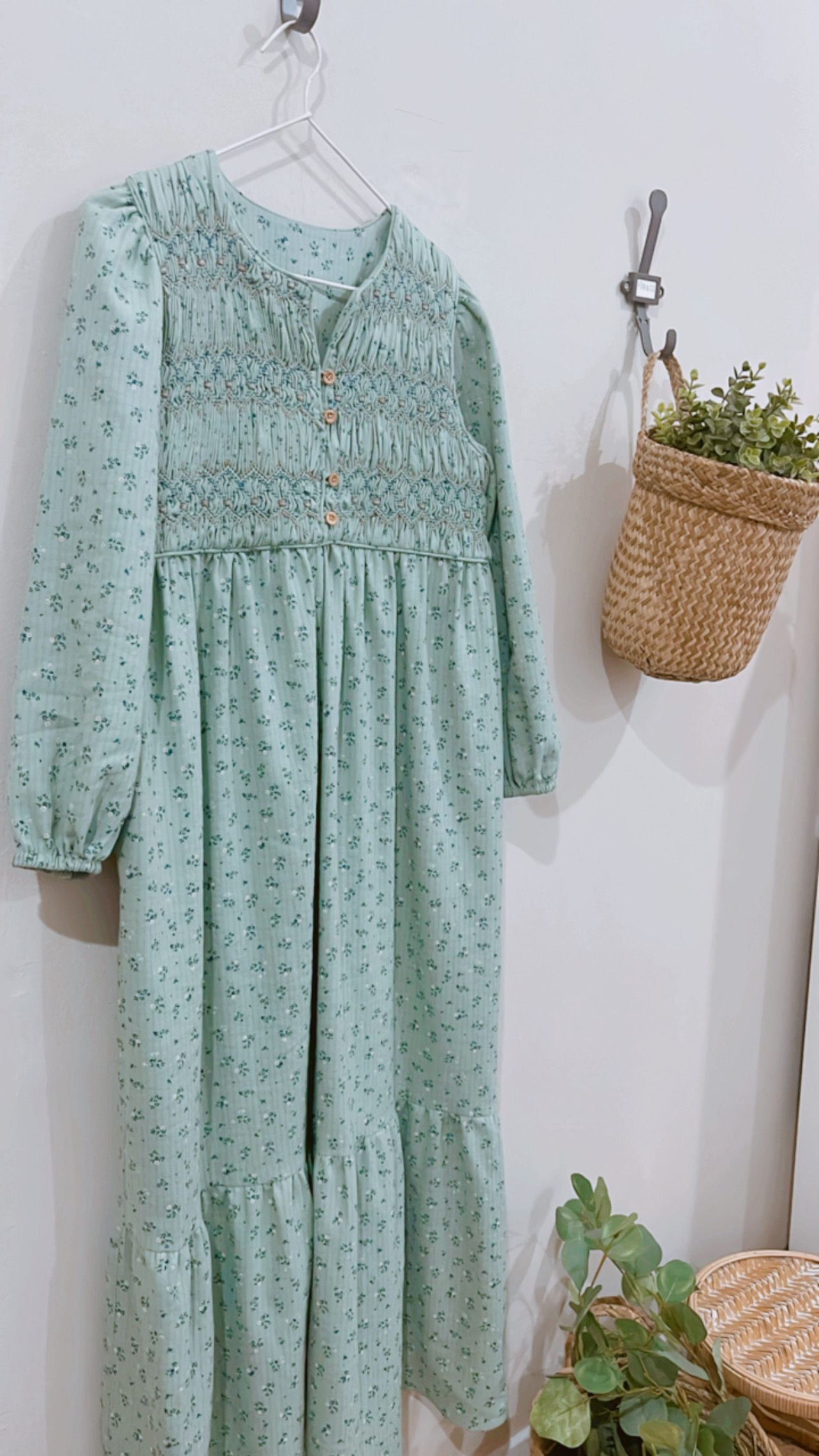 Vestido largo estampado fondo verde agua. Capacete bordado a mano nido abeja con rococós. Escote redondo, abertura delantera que cierra con presillas y botones de madera.Amplio volante fruncido en bajo. Bolsillos en costura lateral.