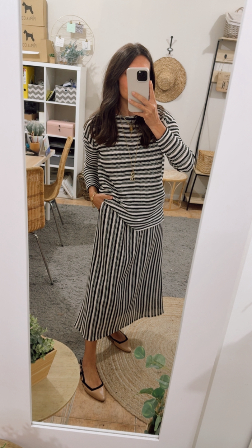 Vestido largo punto calado rayas negro y blanco roto . Corte ligeramente trapecio, escote pico .Bolsillos en costura lateral. Forro interior negro. El tejido tipo crochet es delicado ( enganches)