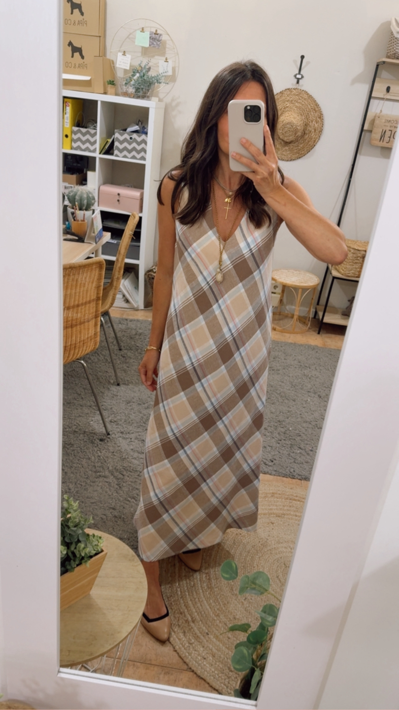Vestido largo lino/viscosa cuadros al bies en tonos topo, beige y azul . Corte ligeramente trapecio, escote pico .Bolsillos en costura lateral. Forro interior blanco roto.