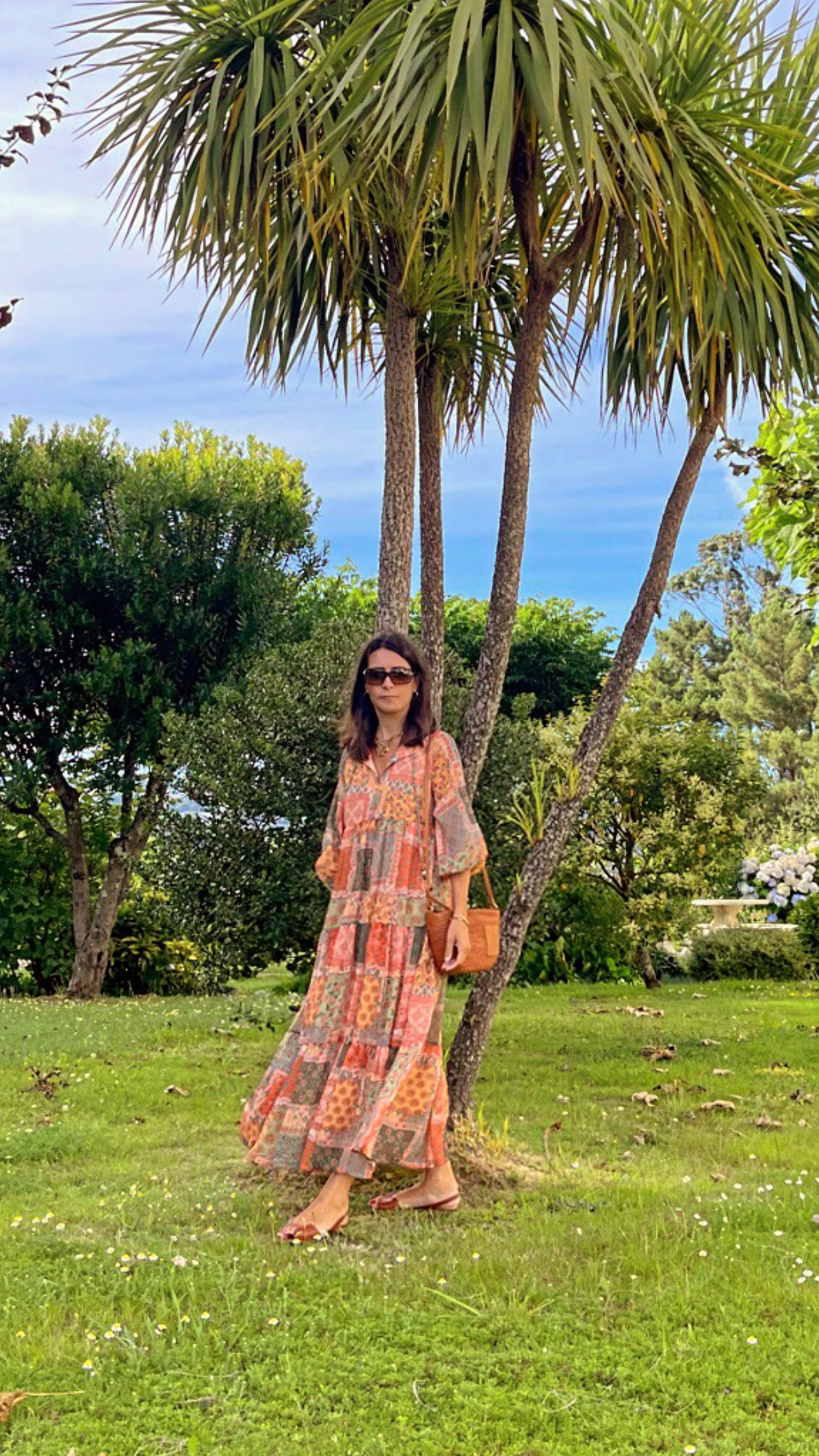 Vestido largo plumeti estampado en tonos verdes. Cuello redondo , capacete cuadrado con entredoses en beige y puntilla alrededor, pequeñas lazadas cierran la abertura delantera.Manga con frunce, largo 3/4 y goma en puño con remate puntilla en beige. El tejido transparente ligeramente ( no lleva forro)